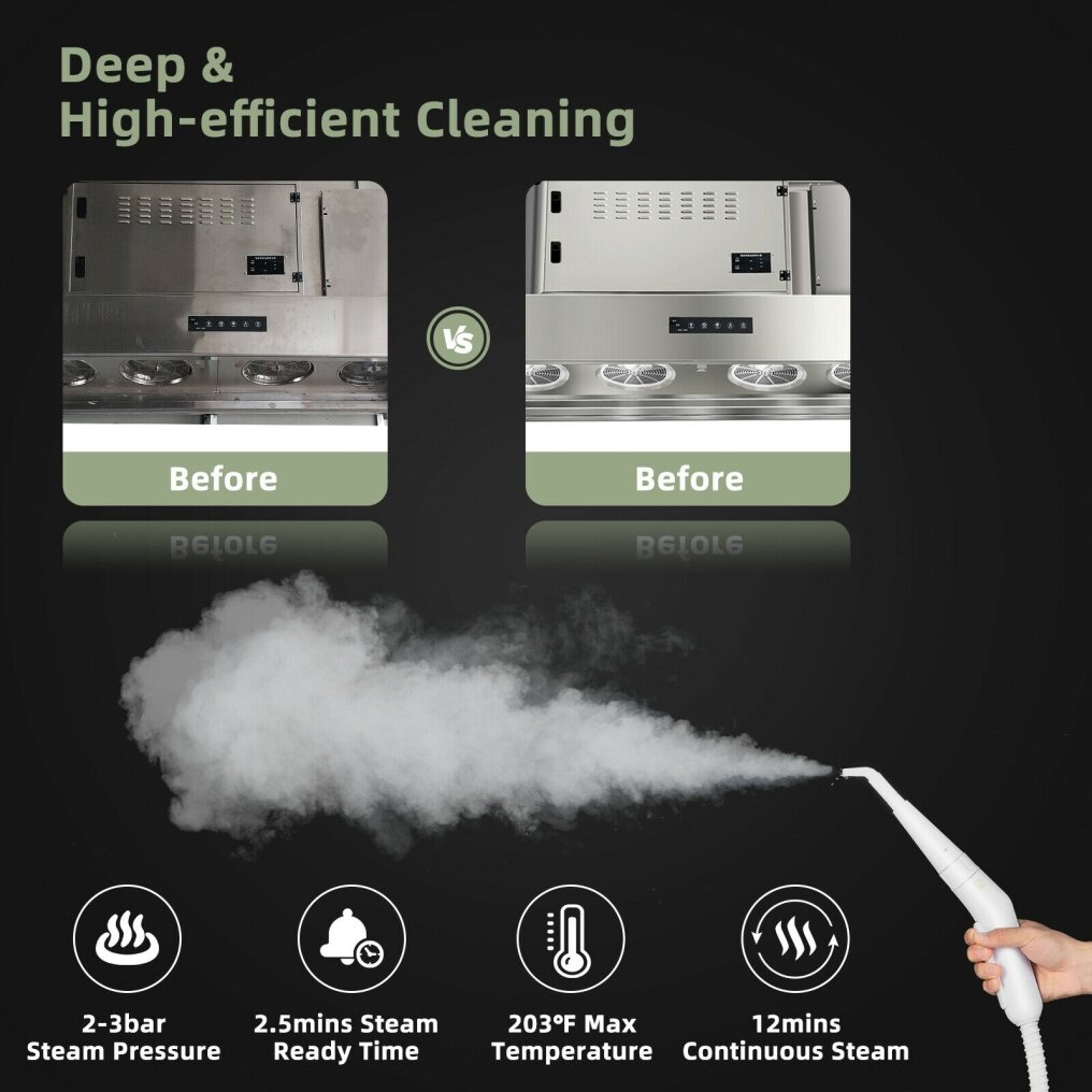 ● Efficient Deep Cleaning: Designed with 1000W powerful motor, this chemical free steam cleaner with 2-3 bar work pressure features steam temperature up to 203°F for an optimal cleaning effect. It helps you remove all kinds of stains, dust and grease.