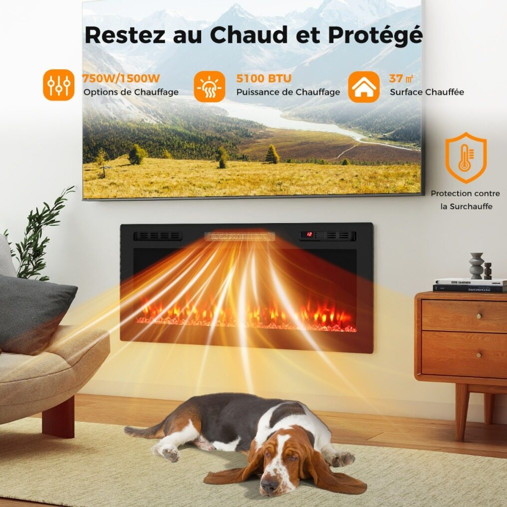 【Efficient Heating Performance】With its two heating modes of 750W and 1500W, this built-in electric fireplace provides up to 5100 BTUs, efficiently heating spaces up to 37 m². It combines power and energy efficiency for convenient temperature control.