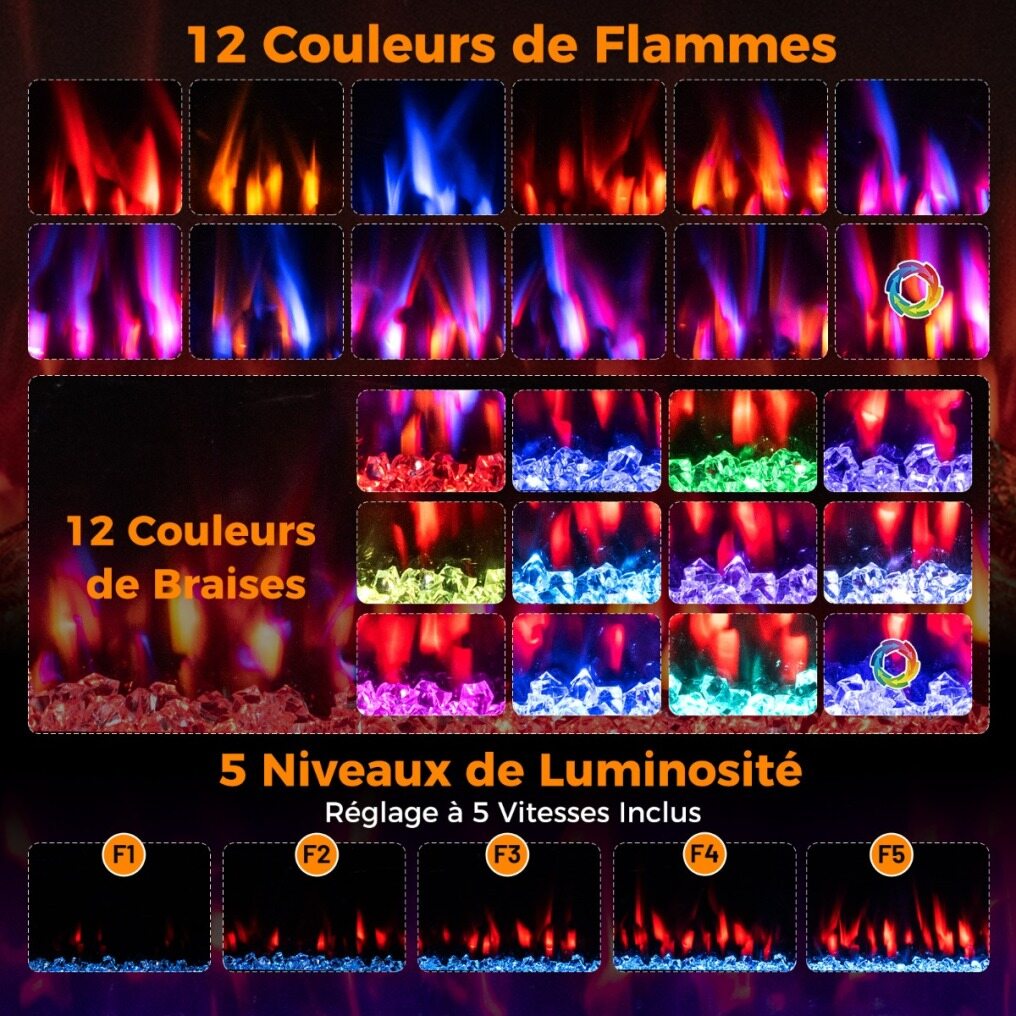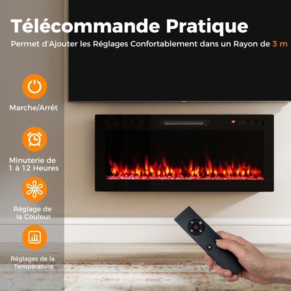 Elevate your modern space with this indoor electric fireplace. It offers two heating modes, 750W and 1500W, delivering up to 5100 BTUs to efficiently heat rooms up to 37 square meters. Compatible with both recessed and wall-mounted installations, it complements a variety of décor styles. It features 12 flame colors and 12 ember tones, with adjustable intensity and speed settings, allowing for year-round operation without heat. Equipped with smart Wi-Fi control via the "Smart Life" app, it's compatible with Alexa and Google Assistant. It also includes a 3-meter remote control and an easy-to-use control panel, offering multiple operating modes. Safety features such as a 1- to 12-hour timer and overheat protection ensure safe and worry-free operation.