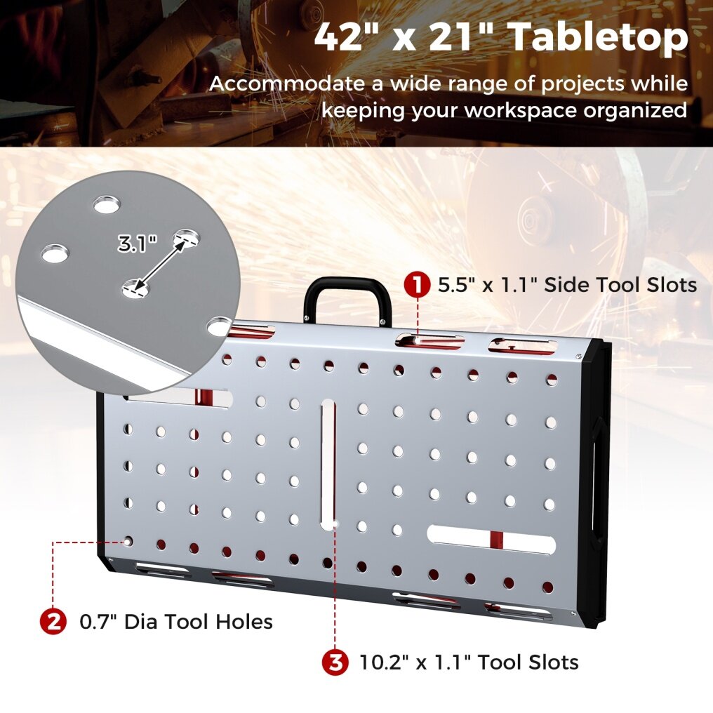 Large Galvanized Metal Tabletop: This workbench features a heat-resistant galvanized metal tabletop, making it ideal for all your welding work. Additionally, the 42" x 21" surface features strategically placed tool slots and holes so you can keep your tools organized and within reach.