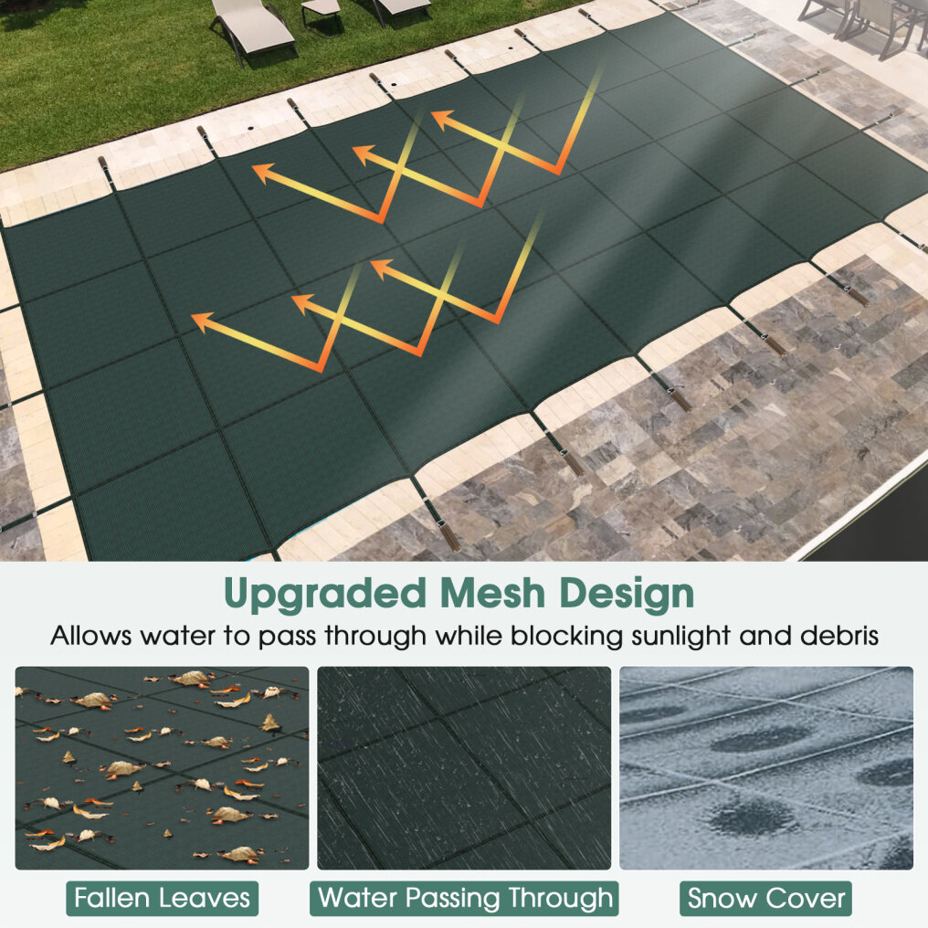 ● Upgraded Mesh Design: With an upgraded mesh design, this pool safety cover allows water to pass through and replenish the swimming pool while effectively blocking sunlight and keeping out debris. Besides, the pool cover also can prevent your kids and pets from accidental downing.