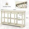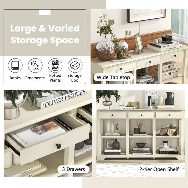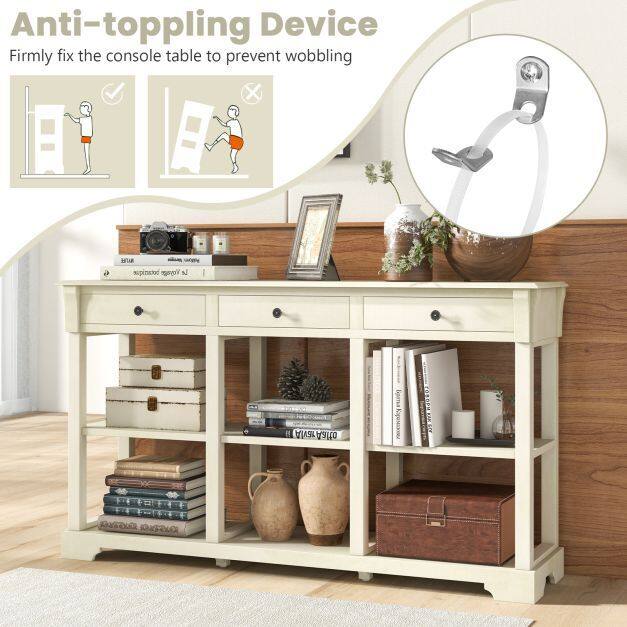 A console table that combines a strong sense of vintage design and classicism's beautiful shape takes you back to the 20th century early times. To meet diversifying storage demands, this sofa table comes with a wide tabletop, 3 drawers and a 2-tier open shelf to keep decorative items and daily supplies in order. In addition, natural wood plus exquisite craftsmanship makes the console stand out from others. Solid wood legs mean better durability, longer life span and higher sturdiness. Moreover, the anti-toppling device takes the stability to a higher level. All in all, the multipurpose long sofa table is a reliable addition to your living room or entryway. If you are looking for such a product, do not hesitate to buy it!