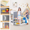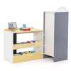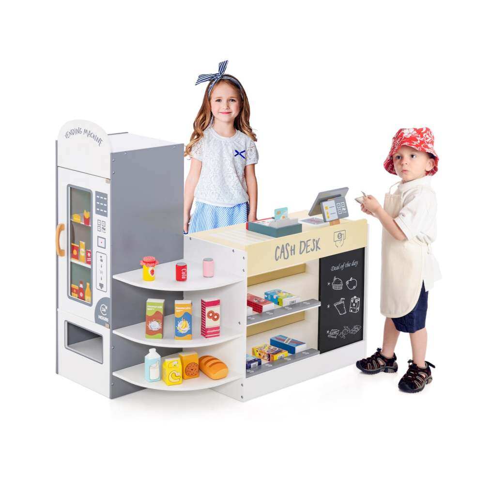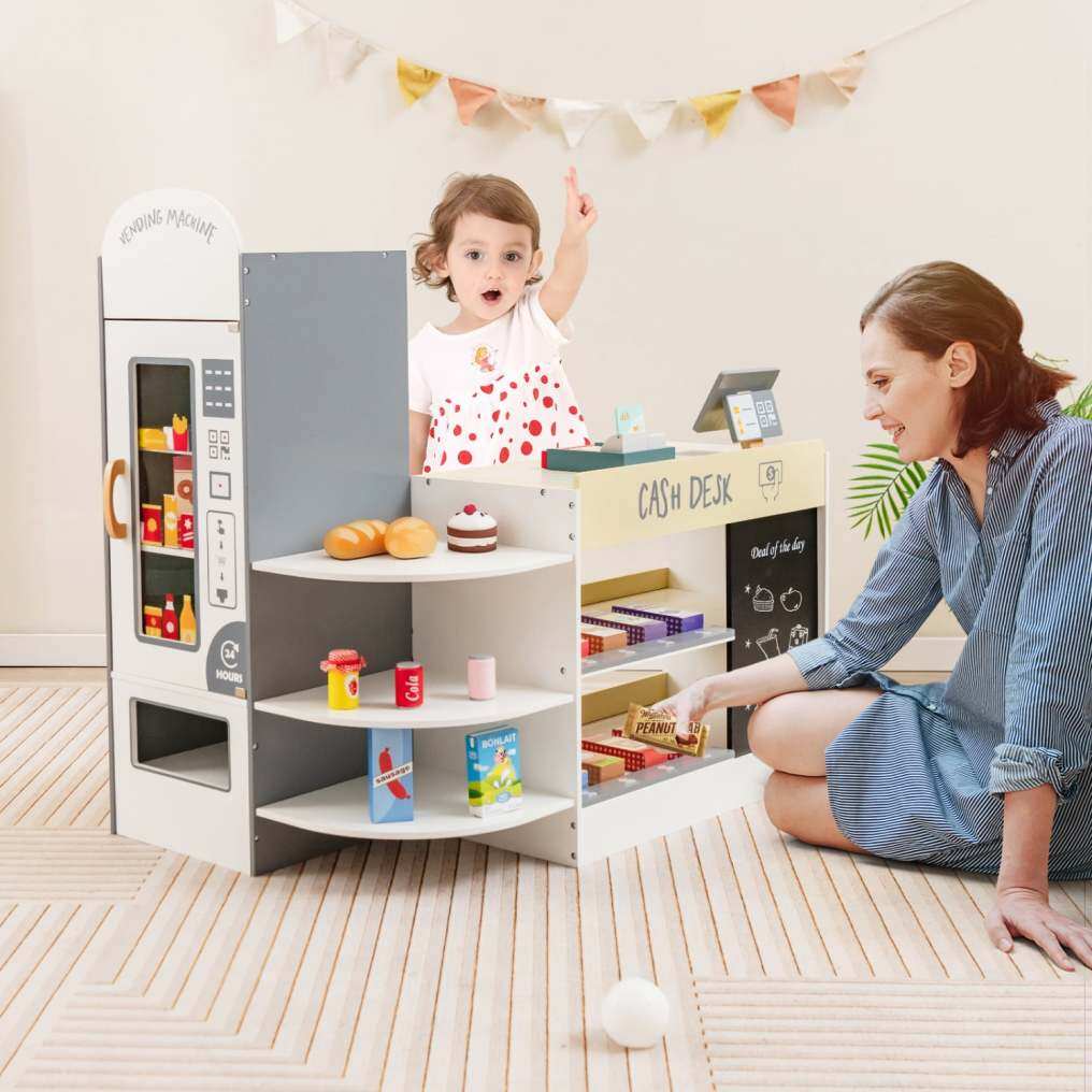 The side vending machine allows kids to pretend to place snacks and beverages, buy different items or take out the items. Toddlers are also allowed to write prices on the chalkboard. They can also simulate checking out or shopping with a wooden POS machine and a credit to learn more about money. Besides, there are 3 open shelves and 2 display racks to store different stuff, helping kids develop a good habit of organizing. Plus, all corners and edges are rounded and burr-free. Moreover, the whole supermarket toy set is approved by ASTM and CPSIA to guarantee superior safety and reliability. If you are looking for such a product, do not hesitate to buy it!