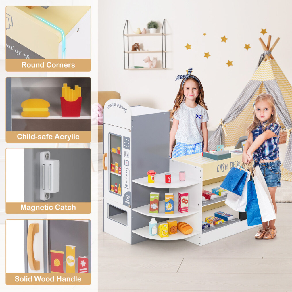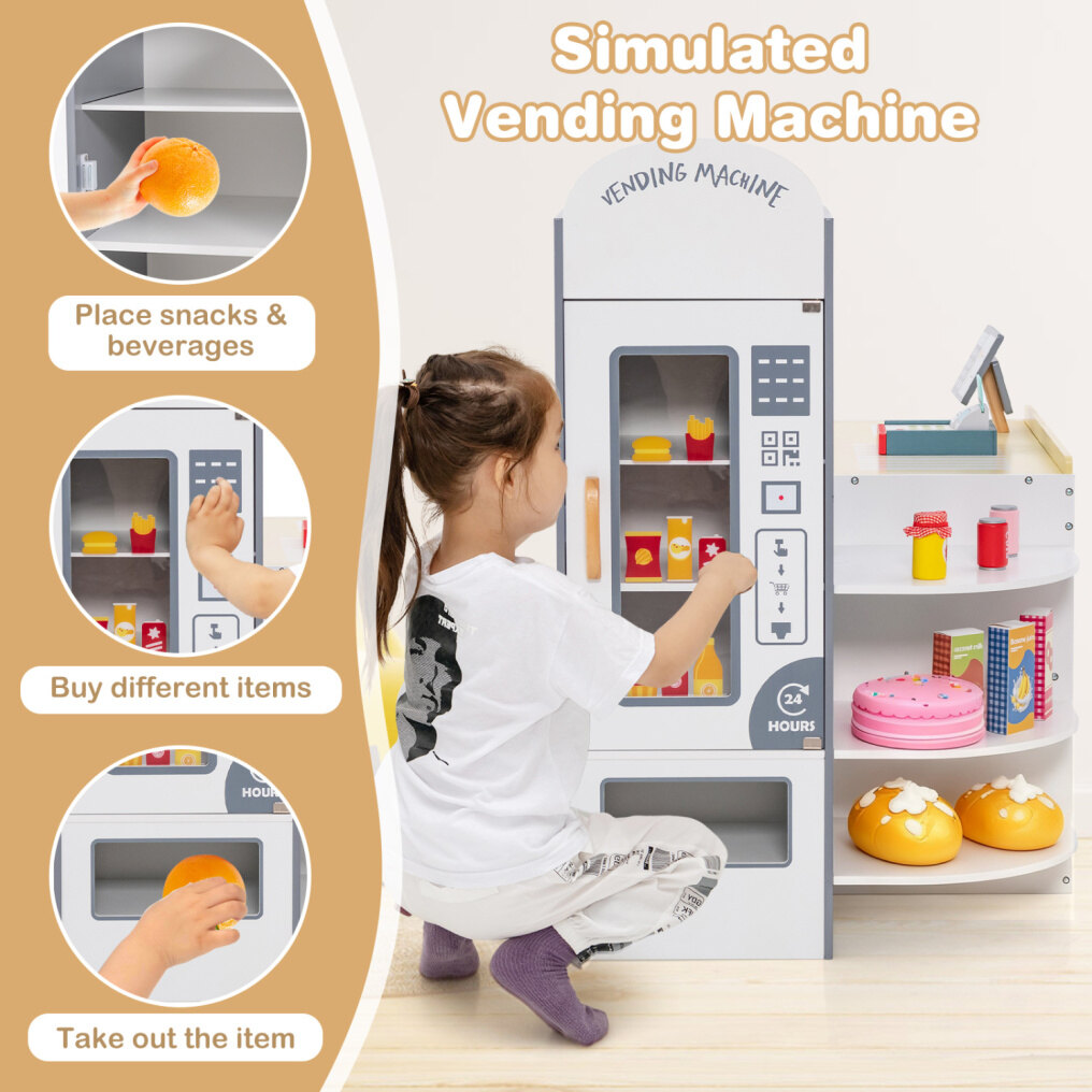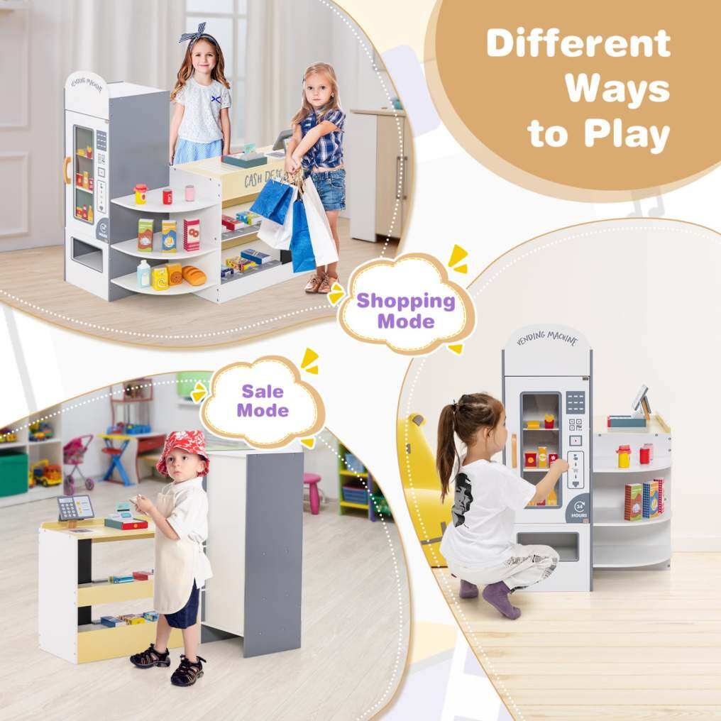 Provide Different Ways to Play: This kid's grocery store playset is designed with a realistic checkout counter(including the screen, scanning area and conveyor belt patterns) and a simulated vending machine. Your kids can choose to enjoy the sale mode or shopping mode with their friends to have hours of fun.