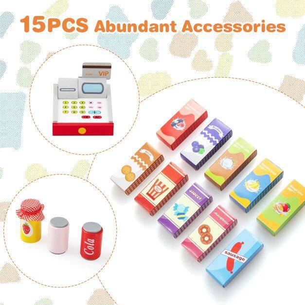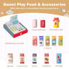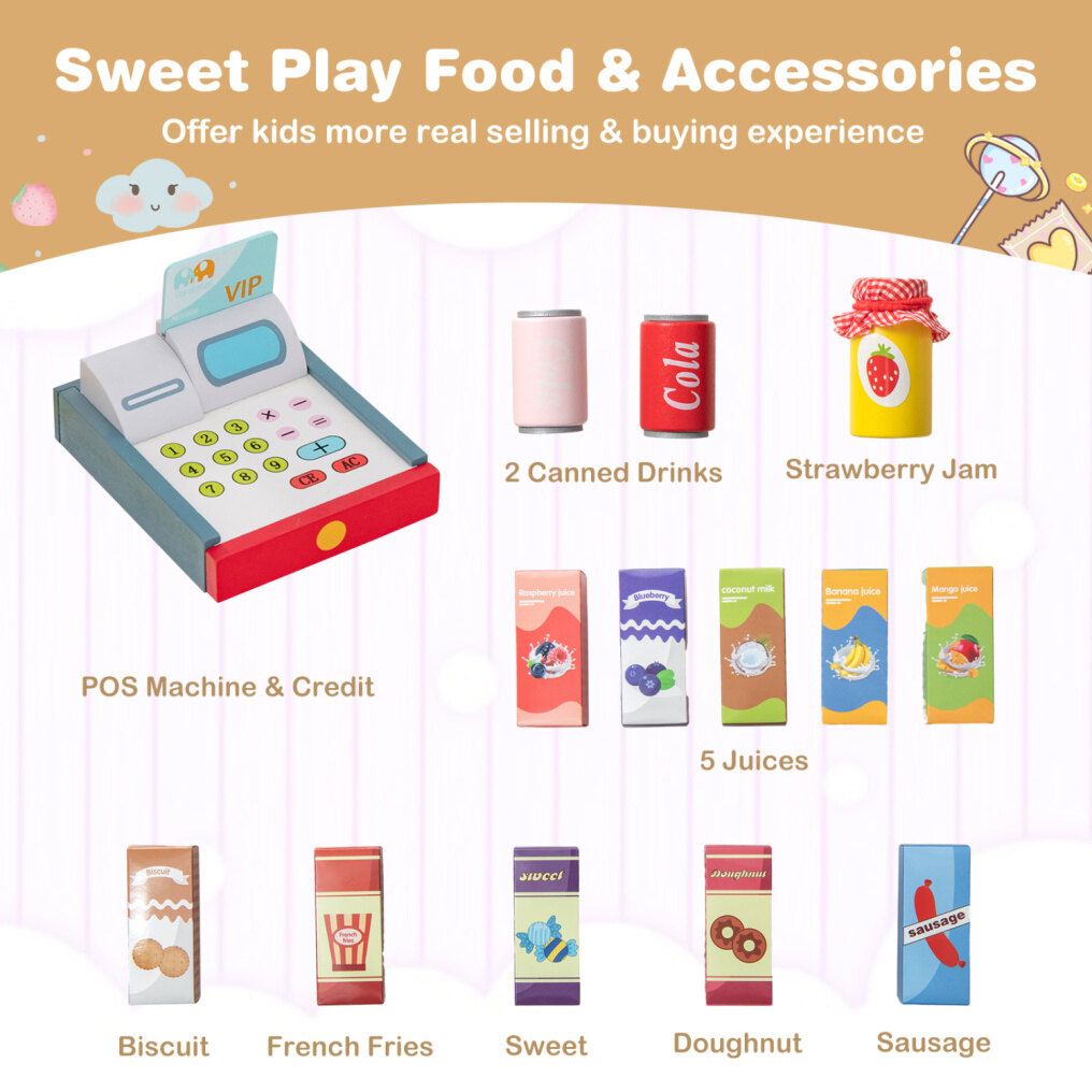 Sweet Play Food and Accessories: This supermarket play toy includes 5 juices, 2 canned drinks, 1 strawberry jam, 1 biscuit, 1 sweet, 1 doughnut, 1 sausage and 1 french fries. Meanwhile, the POS machine and credit also offer kids more real selling and buying experience.