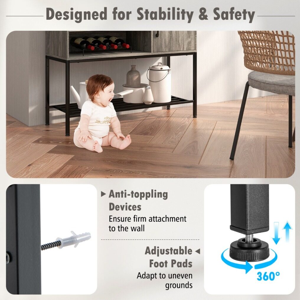 Equipped with 2 AC outlets and 2 USB ports, the buffet cabinet charges your devices easily. While the cable management hole keeps wires out of sight. Besides, this console table boasts ample storage space to hold items within reach. Bottom metal shelf offers easy access to different kinds of utensils. The convenient handle allows for easy opening of the door yet the magnetic door catch ensures a firm close. In addition, the sturdy metal frame and adjustable foot pads ensure stability. Designed for stability and safety, there are anti-toppling devices included. This buffet sideboard table is a perfect addition to any room, such as the kitchen, dining room, living room or entryway. Furthermore, installation is a breeze with an easy-to-follow user’s manual.