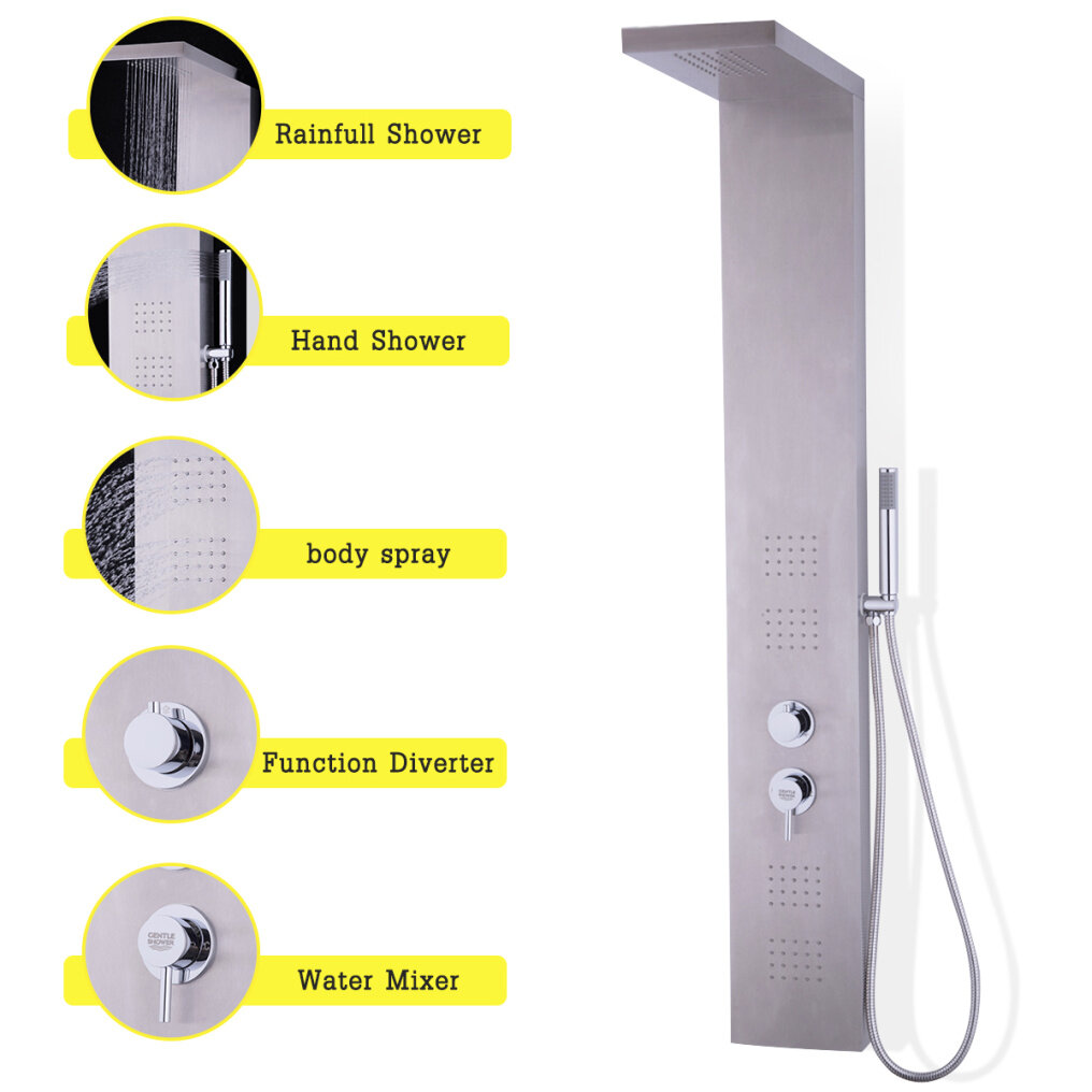 - 2 body massage streams, ABS handheld showerhead and a rainfall overhead shower