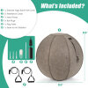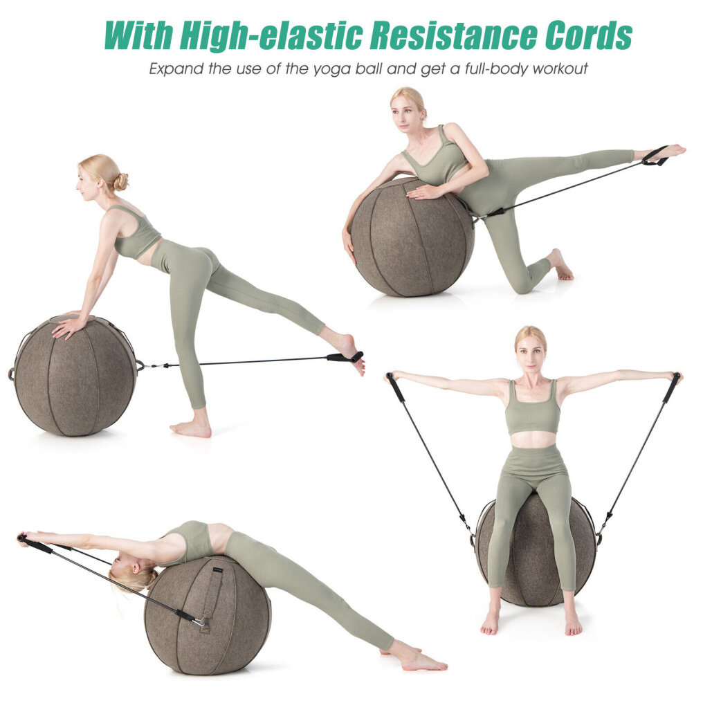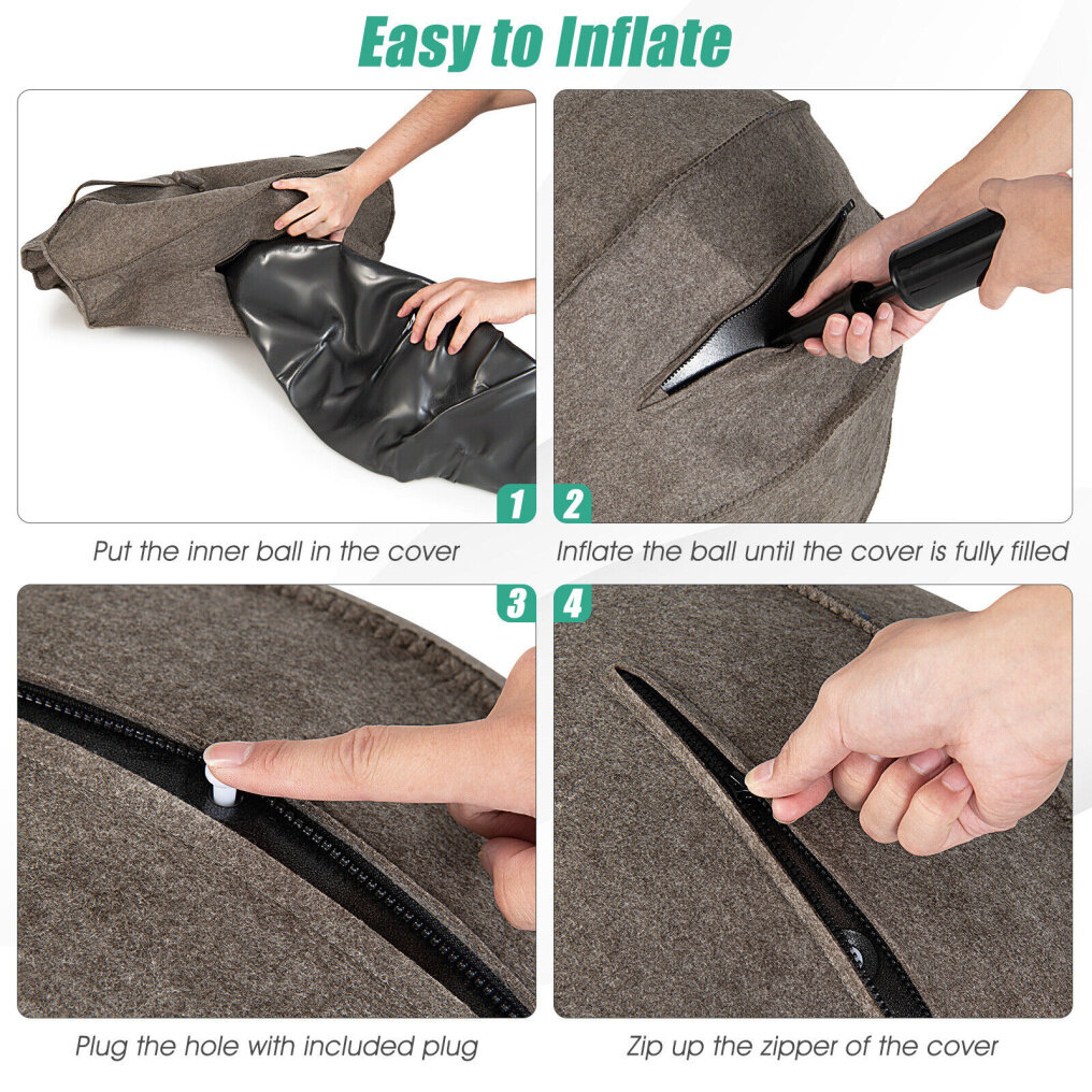 A perfect combination of exercise yoga ball and ergonomic office sitting chair! With a comfortable and anti-slip felt cover, this ball sitting chair can be a great alternative to a traditional office chair, which makes you naturally sit upright and helps strengthen your core as you sit. The soft and durable felt cover is removable and machine washable. Moreover, this balance ball chair is also a perfect companion for yoga, meditation, body stretching, workout, physical therapy, pregnancy birthing, etc. You can use the included resistance bands to perform various exercises. The built-in handles make it convenient to carry the ball around. Besides, it is easy to set up in a short time, only need 4 steps: ① Put the inner ball in the cover; ② Inflate the ball until the cover is fully filled; ③ Plug the hole with the included plug; ④ Zip up the zipper of the cover. Please make sure you line up the ball's air hole with the zipper before inflating.