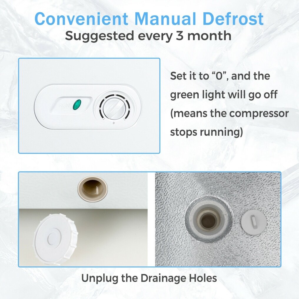 Its internal capacity is large enough to hold all kinds of frozen foods and bulky ingredients, including turkeys, ribs and pizzas. In addition, the freezer also comes with 3 storage baskets, which can store items in an orderly manner and effectively use the space, allowing you to find what you need quickly. And you can adjust the temperature by the bottom knob, or turn off the compressor for manual defrosting. What's more, its simple appearance and compact size are suitable for various limited spaces, such as dormitories, office lounges, RVs and more, allowing you to enjoy fresh food anytime and anywhere.
