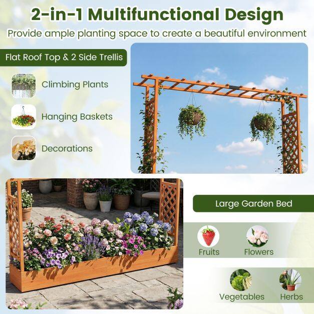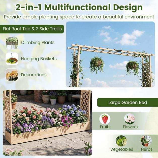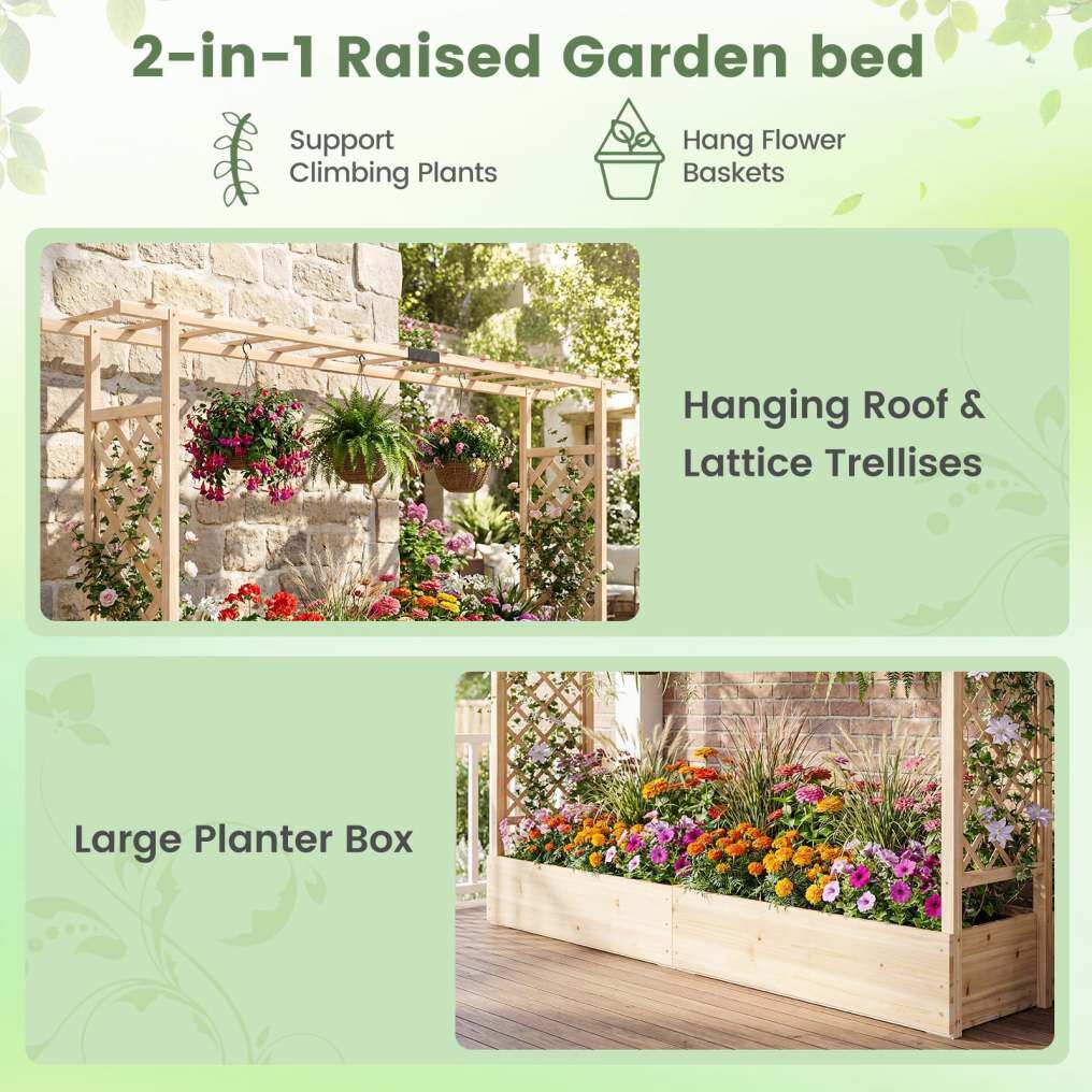● Side Trellis & Hanging Roof: 2 side vertical trellis provide sturdy support to allow climbing plants to grow vertically while maximizing space utilization. Hanging roof with extended design creates additional overhead room for hanging basket plants, climbing vines, decorative items.