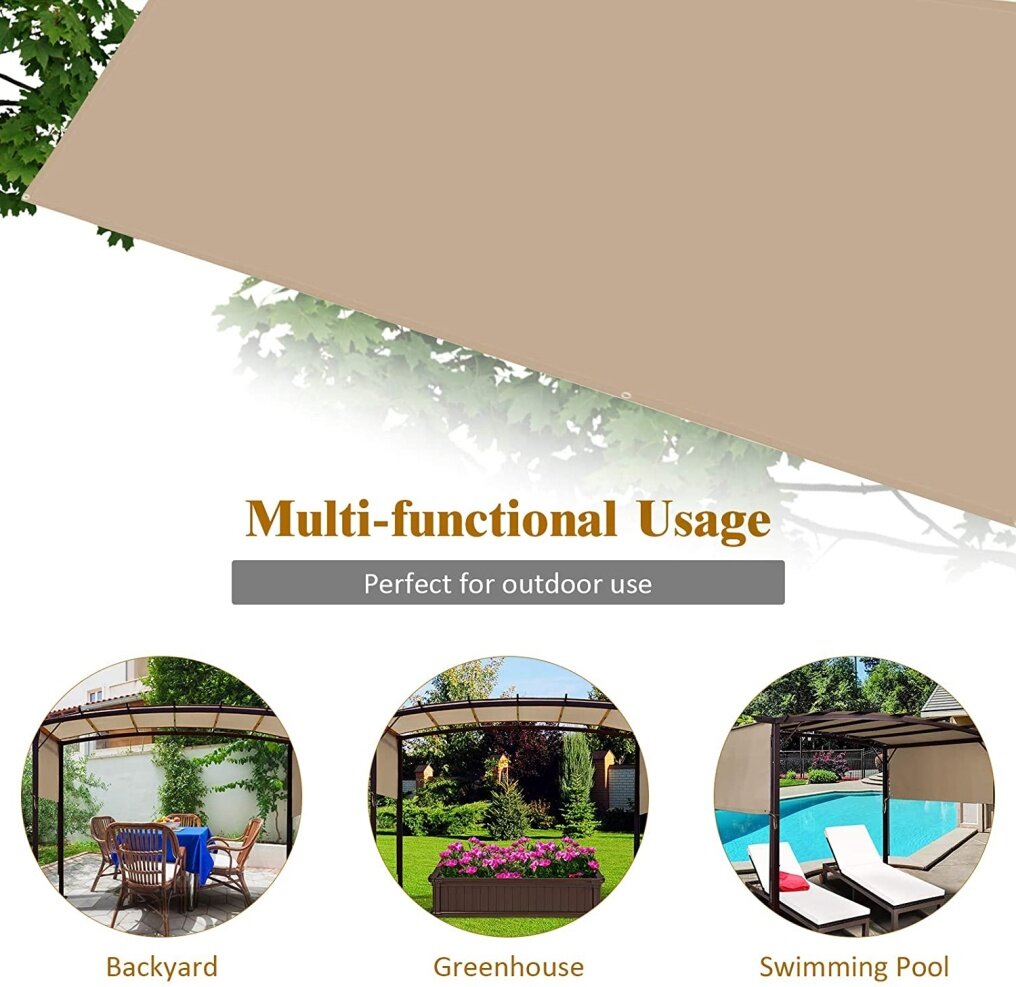 Made of premium polyester cloth, the shade cloth is durable and sturdy enough for long-time use. And it’s also wear-resistant and tear-resistant, which is perfect for pergola structure on multiply occasions. Meanwhile, edges and corners are reinforced by a strong stitched seam and durable copper grommets for better strength and toughness. More importantly, the pergola canopy is covered with PA coating, which blocks up most harmful sunlight to offer a cool and shaded place. Additionally, this replacement pergola cover comes with 4 convenient straps for fixing onto the frames tightly. It can match well with your gazebo and furniture, offering a cool spot.