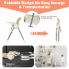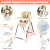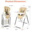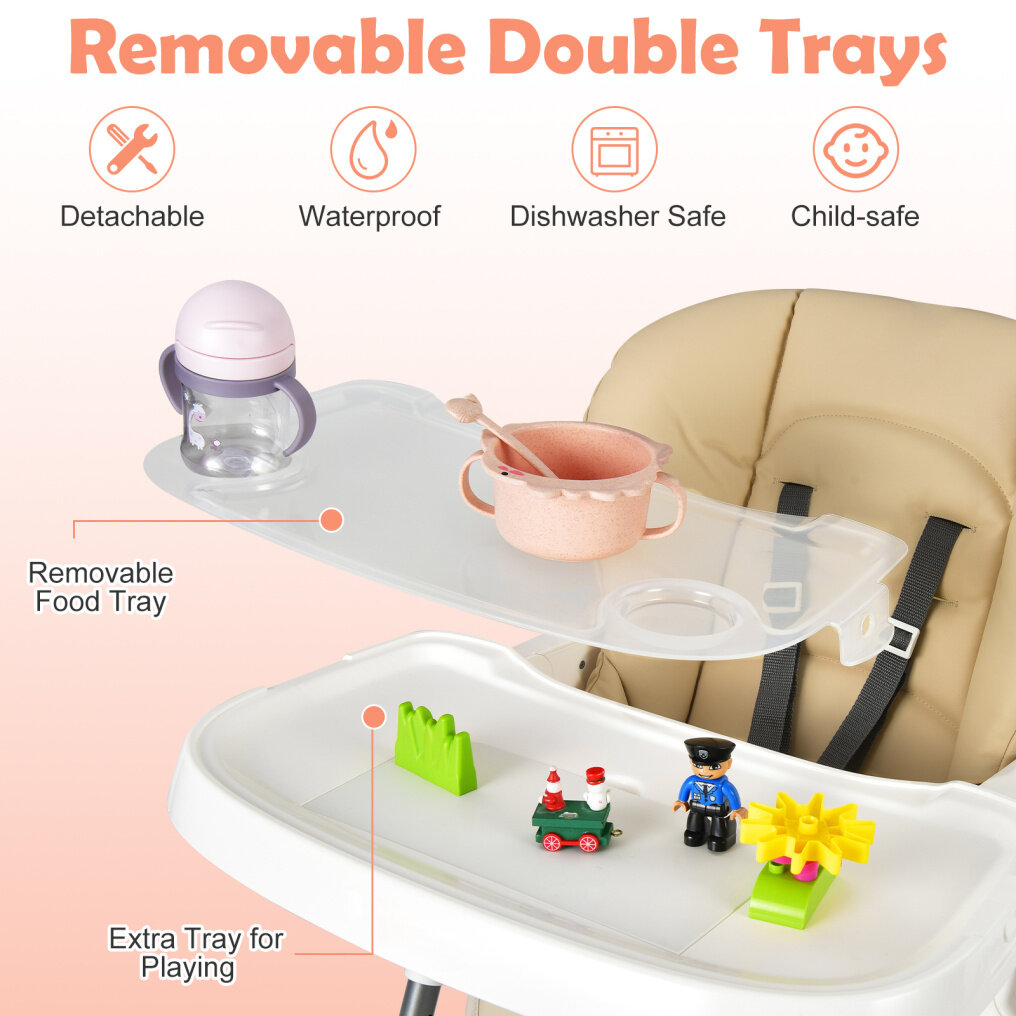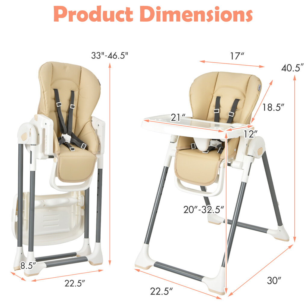 This high chair comes with 4 reclining angles and 3-position footrest to keep your baby comfortable during meals, resting or playing. 8 height positions are provided to match dining tables at different heights. And the tray position is adjustable to 3 positions, so that you can give your child more room as they get older. With the stable triangular structure, non-slip foot pads and 5-point safety harness, the high chair ensures excellent security. The thick and soft padded seat cushion with easy-to-clean PU leather surface provides all the comfort your little one needs. Besides, the back storage bag is convenient to store your baby's stuff and the book holder on the lower tray brings great convenience. When you're not using this chair, it can be quickly folded up and placed in the corner or next to the cupboard which will not occupy much space.