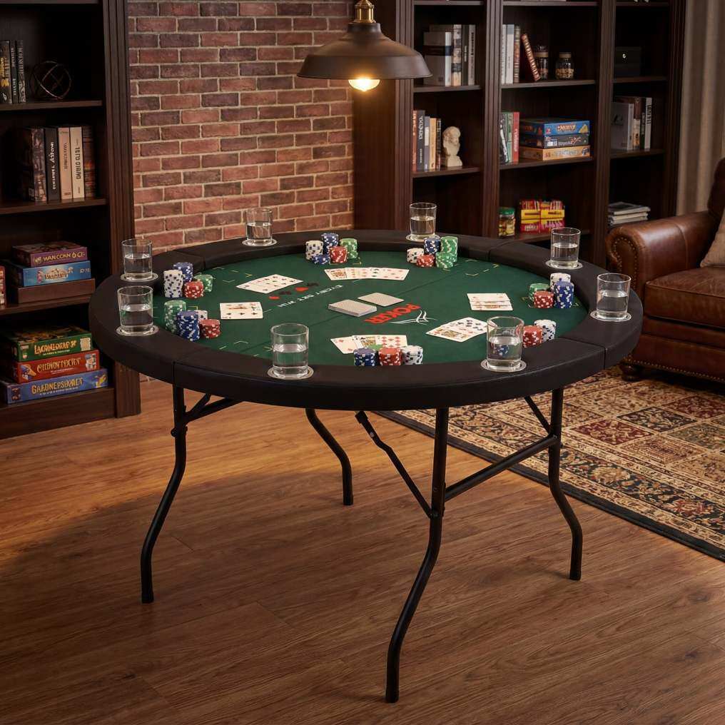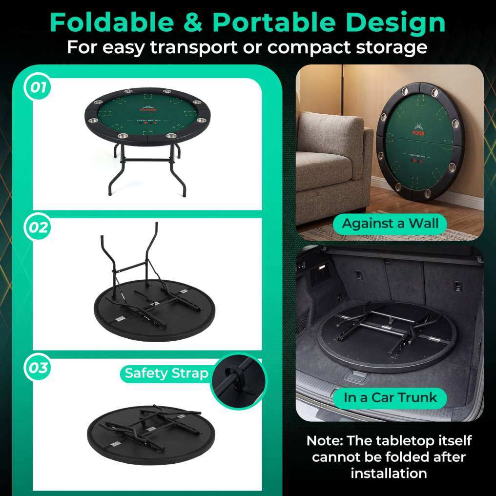 ● Foldable & Portable Design: The legs of this blackjack game table feature a quick-folding mechanism for ultimate convenience. It allows the entire table to be stored flat for easy transport or compact storage against a wall or in a car trunk. Note: The tabletop itself cannot be folded after installation.