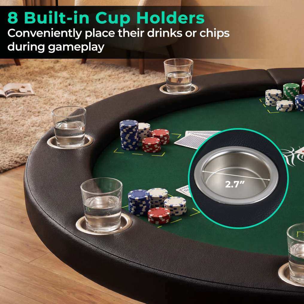 ● Cup Holders & Wide Applications: Equipped with 8 built-in cup holders, this card table allows players to conveniently place their drinks or chips during gameplay. Moreover, it provides endless entertainment and quality leisure time for family gatherings, friendly competitions, team-building activities, or game nights.