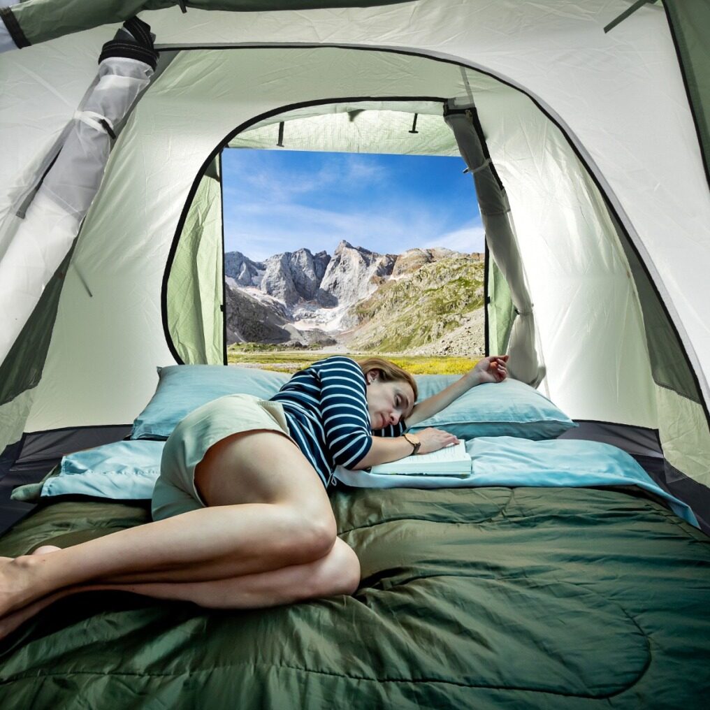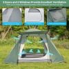 Excellent Ventilation & Safety Design: Designed with a large section of mesh and 2 D-shaped doors with dual zippers, the camping tent allows you to enjoy the refreshing breeze while cooling the tent from all sides. Besides, being equipped with 8.5 mm thickened fiberglass rods, 23 metal ground stakes, and 8 windproof ropes, the tent shows great wind-resistant performance.