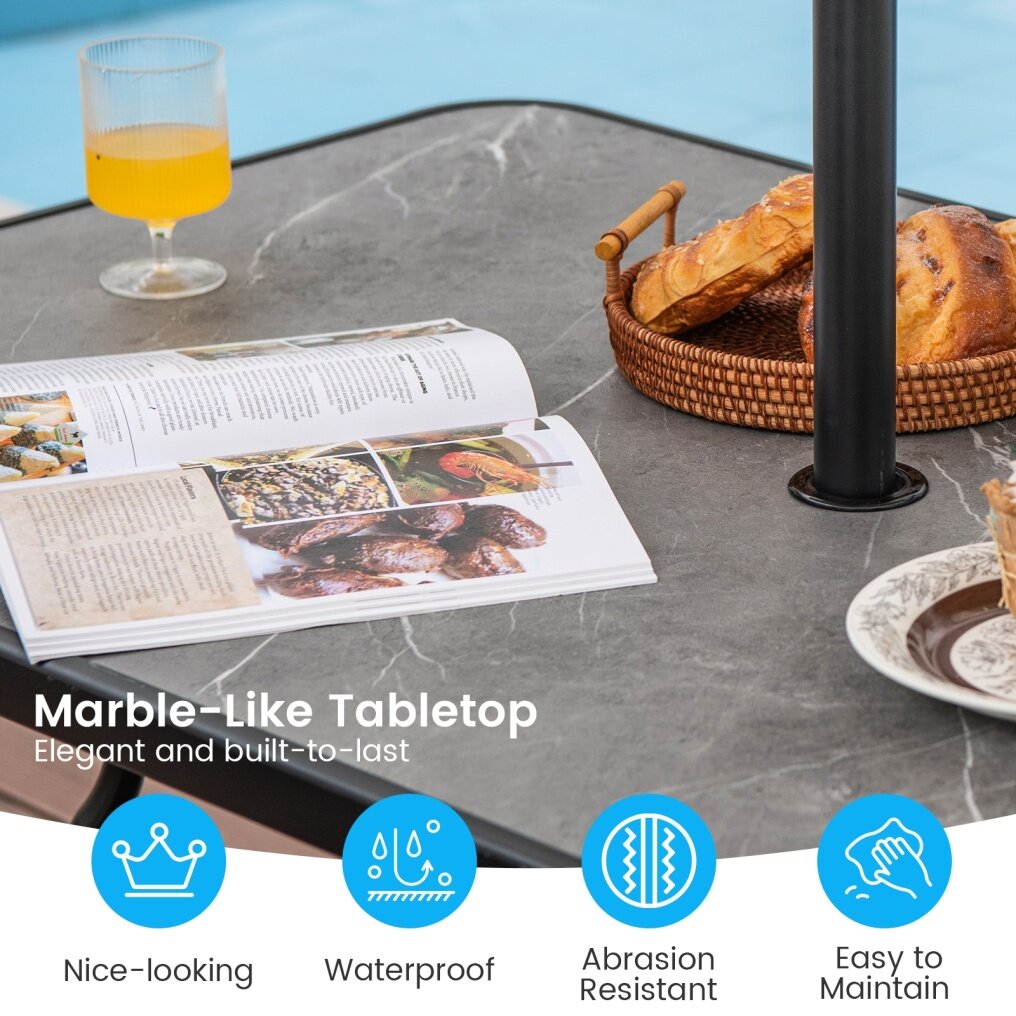 ● Marble-Like Tabletop: The tabletop is made of high-grade SPC, which is waterproof and abrasion resistant, ensuring long-lasting outdoor use. And the marble-like surface makes the tabletop nice-looking and appealing.