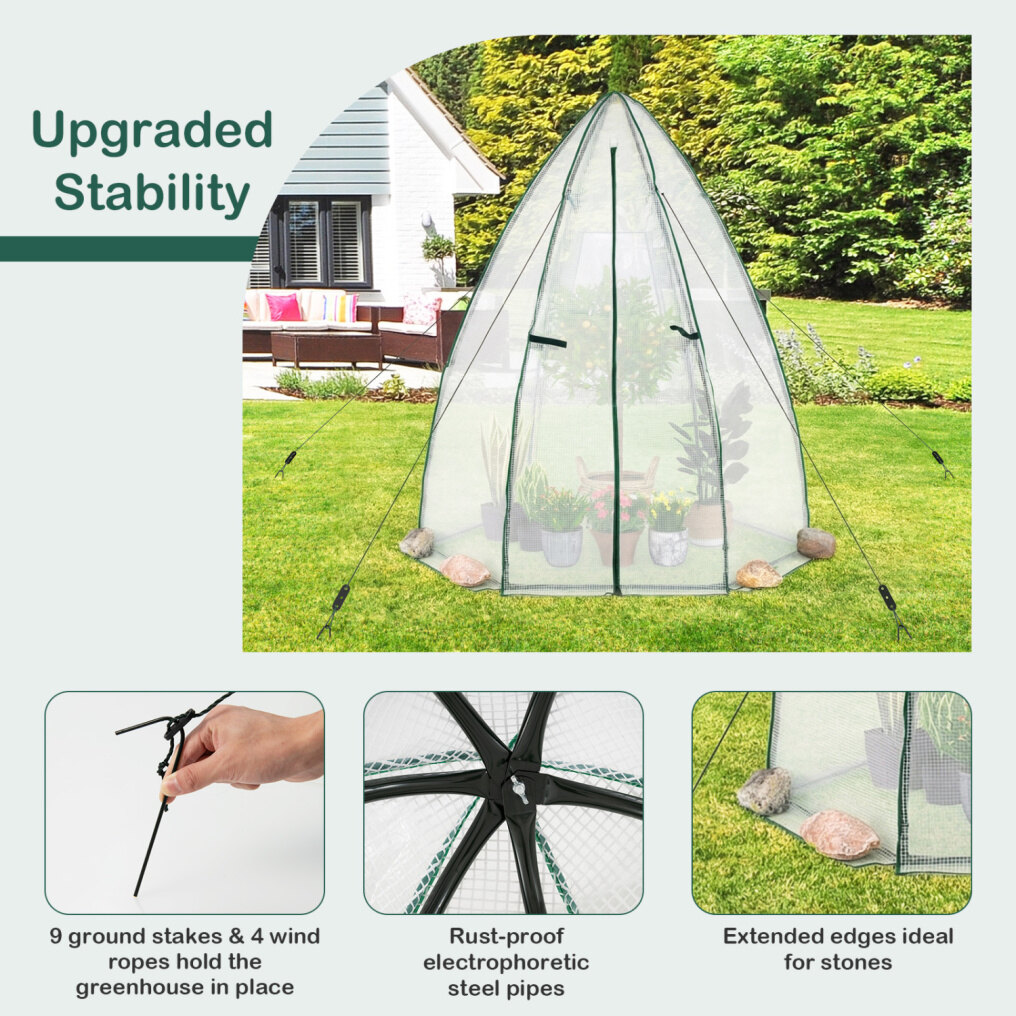 ● Excellent Wind Resistance: The portable greenhouse is equipped with 9 metal stakes, 4 wind ropes, and 5 fixed holes for firmly fixing it on the ground, adding strong wind resistance. Moreover, you can also put stones on the overlong cover, improving stability and safety on windy days.