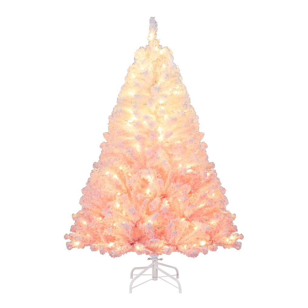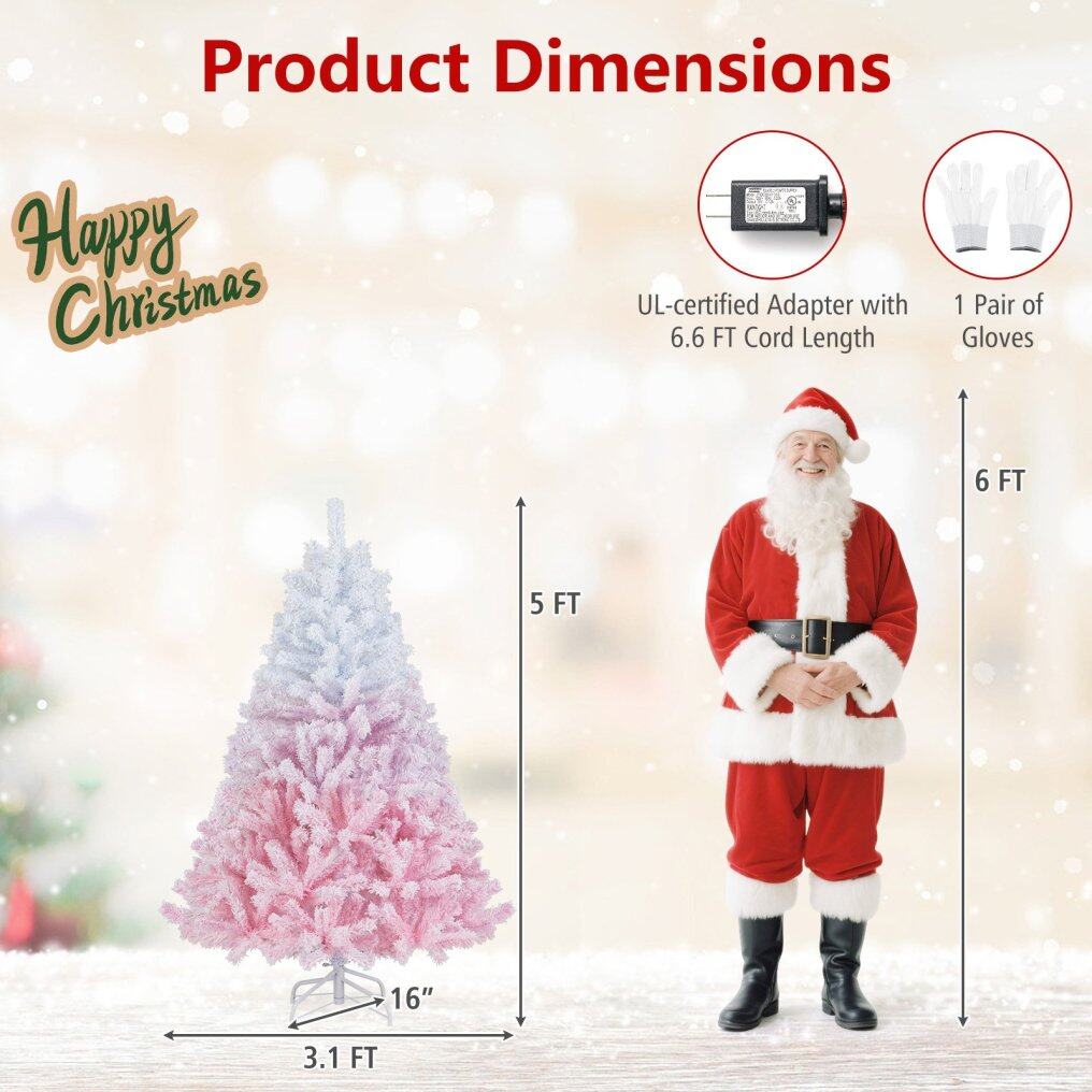 ● Striking Pink Gradient Design: This 5/6/7/8 ft snow-flocked artificial Christmas tree features a stunning gradient color - white to pink, bringing a refreshing twist and elegant touch to the festive season. It stands out with its stylish and eye-catching hues.