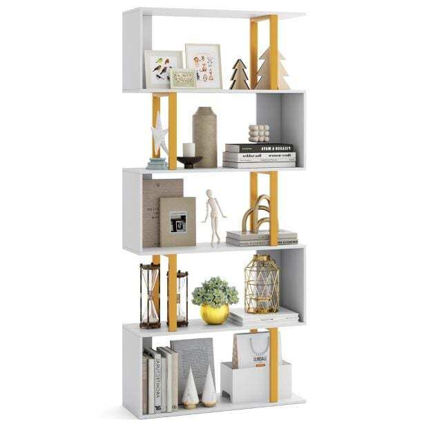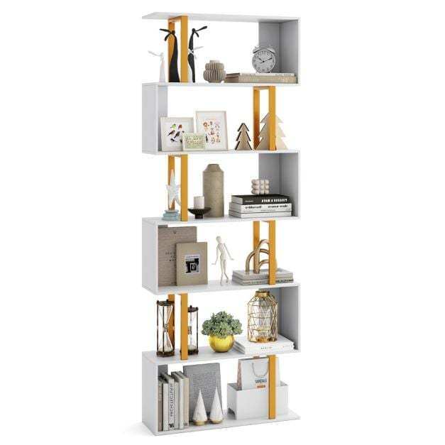 Discover the modern centerpiece to elevate your interior! Imagine the allure of a stunning gold frame and sleek S-shaped shelves transforming your room into a showcase of modern elegance. This chic, towering bookshelf not only captivates the eye but offers an abundance of space on its multi-tier shelves - perfect for your books and beloved treasures. Built with stability in mind and mindful of your safety with anti-tipping features, this freestanding marvel seamlessly blends sophistication with practicality. Whether it’s your living room, bedroom, or office, watch it seamlessly conform to your space’s aesthetic and functional needs. Redefine your living space with style and confidence today!