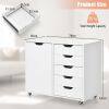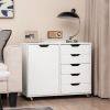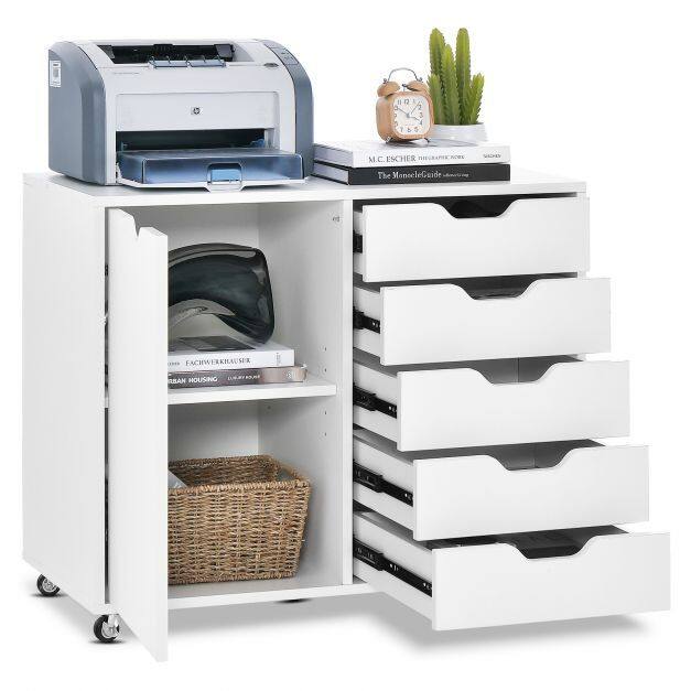 It features a wide cabinet top, single-door cabinet and 5 drawers to enlarge storage capacity and classification space for a variety of office supplies and daily items. Besides, the 5-position adjustable shelf inside allows you to customize storage space with great convenience. What's more, thickened board with premium edge-sealing means higher sturdiness, better durability, and a longer life span. Equipped with 5 360°swivel casters, 2 of which are lockable, the printer stand can go anywhere you like. Whether used as a storage dresser or file cabinet, it will undoubtedly be a charming complement to your study, living room, and office, etc. If you are looking for a 5-Drawer Chest with Door like this, do not hesitate to place an order!