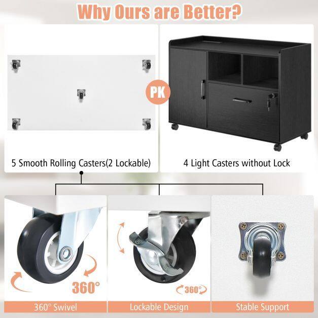 Large Storage Space with Adjustable Shelf: The spacious desktop can hold your printer or scanner. A side door cabinet with a 5-position adjustable shelf makes it easy to store different-sized items. In addition, this mobile filing cabinet is also designed with 5 drawers, which provide ideal storage space for pens, staplers, calculators and other office supplies.