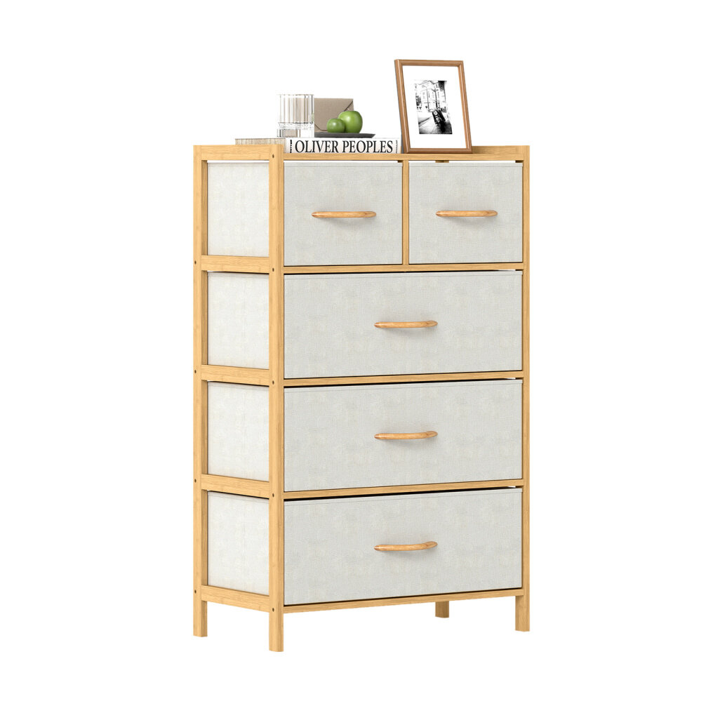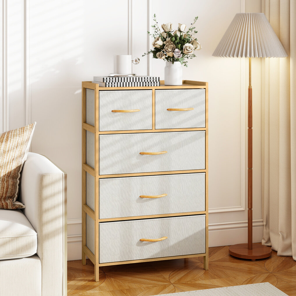 ● Strength Meets Beauty: Made of natural bamboo material, this 5-drawer dresser seamlessly blends durability with elegance. The smooth polished surface enhances its long-lasting beauty, making it a stunning and enduring piece for your home.