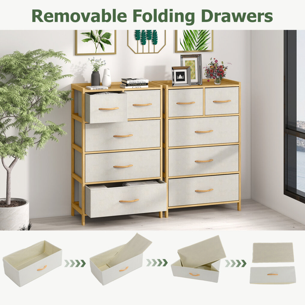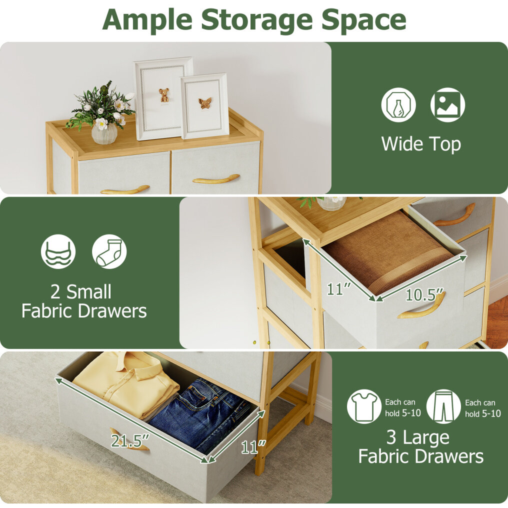● Considerate Details: The dresser comes with 5 foldable fabric drawers to simplify assembly process and storage. Additionally, the raised edges prevent daily items from falling while solid beech handle allows for easily opening and closing the drawers.