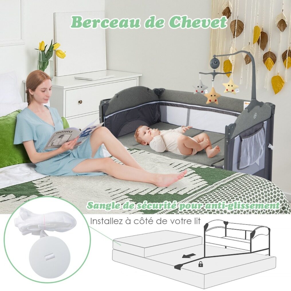 This crib allows your baby to sleep right next to you! Simply lower the side guardrail and attach the crib to your bed. It has a toy holder with music box to entertain them and lull them to sleep. It can be used as a rocking crib, changing table, freestanding crib or playpen for 0-9 months. The side storage basket can be attached to the crib when using it as a changing table. It is durable, its structure is stable and has wheels for easy movement. You can fold it and store it in the bag for easy movement.