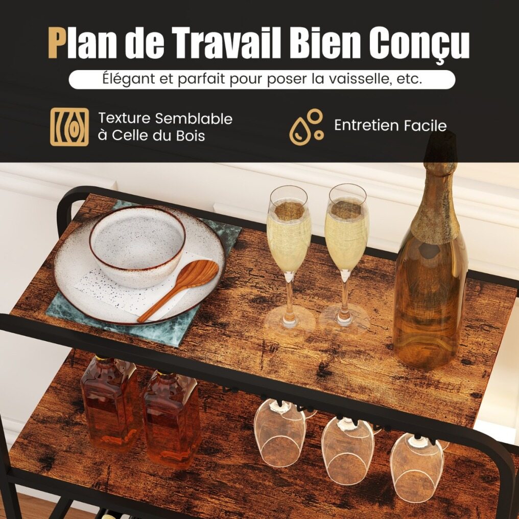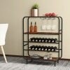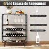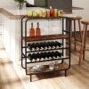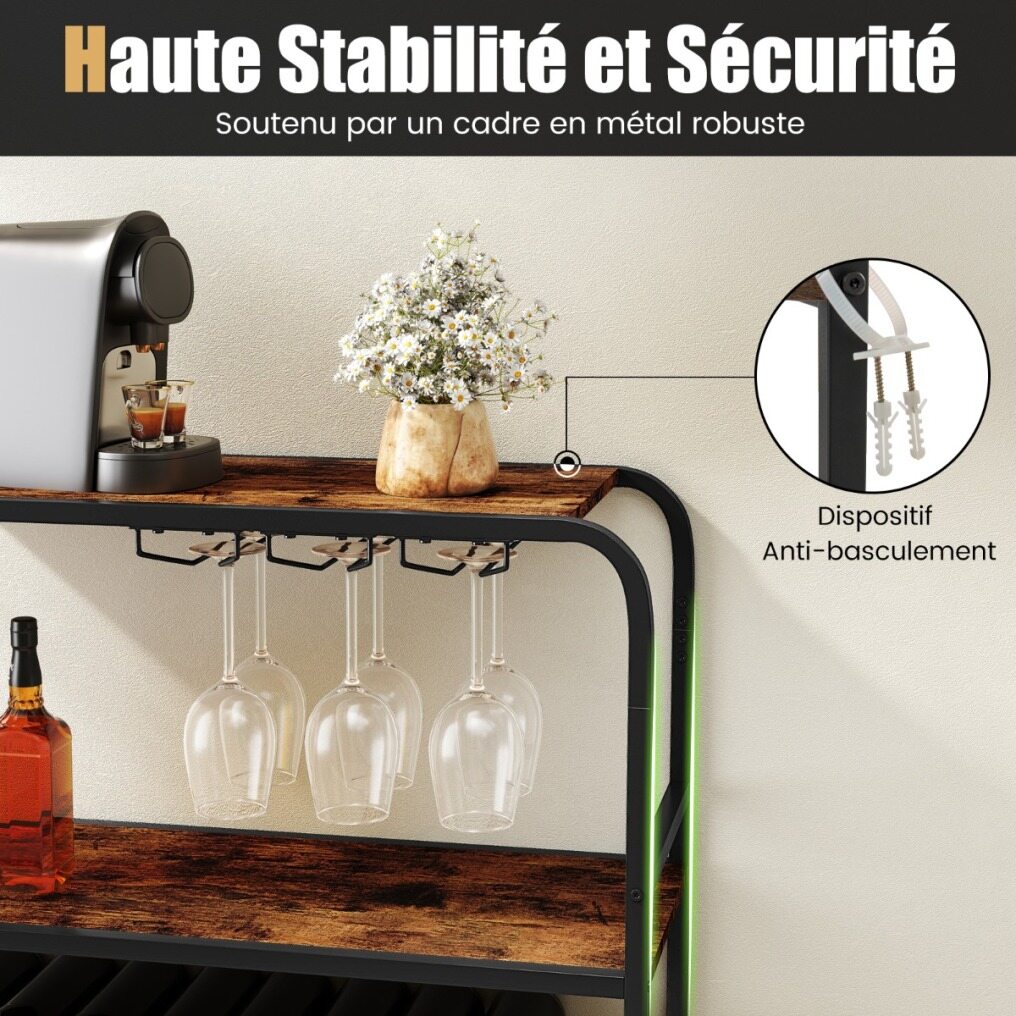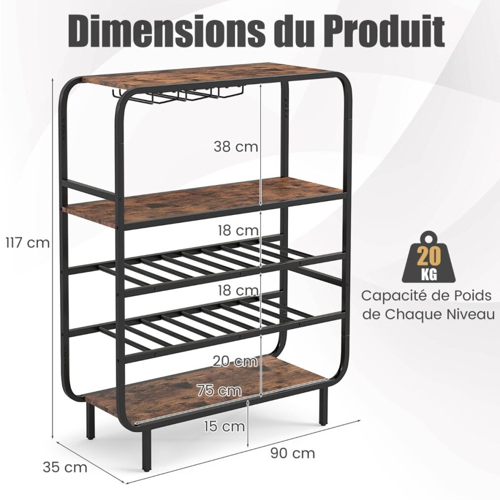 This wine organizer features two bottle tiers and three additional shelves. The shelves are finished with an elegant wood texture, ideal for holding dishes and other items. Equipped with secure holders for 12 stemmed glasses, this wine rack ensures all your wine accessories are neatly organized and within easy reach. The sturdy metal frame, fitted with anti-tip devices and adjustable feet, provides stability and security. Combining functionality and refined aesthetics, this wine rack will be a perfect addition to your kitchen, dining room, or home bar.