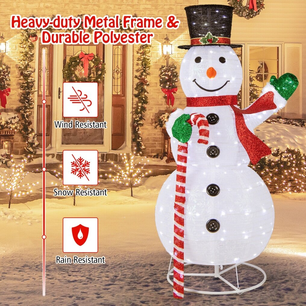 ● Lighted Pop-up Snowman: The pop-up snowman with 180 cool white lights creates a glowing nighttime display to illuminate your yard and enhance festival atmosphere. This lighted Christmas decoration is attractive both at day and nights.
