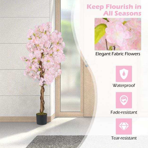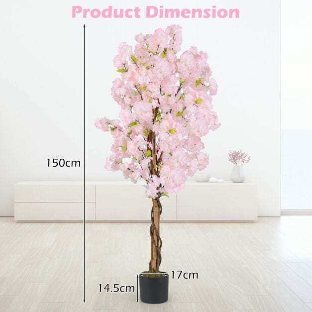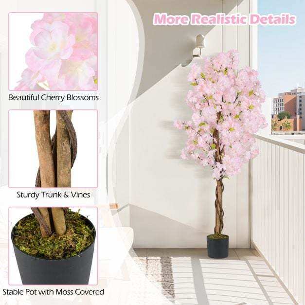 ● Vivid and Natural Appearance: This 5 ft tall artificial cherry blossom tree showcases 972 stunning pink flowers and 144 verdant green leaves, closely resembling the appearance of real cherry blooms. Moreover, it is adorned with realistic moss, real wood trunks, and simulated PE rattans, enhancing the natural appearance.
