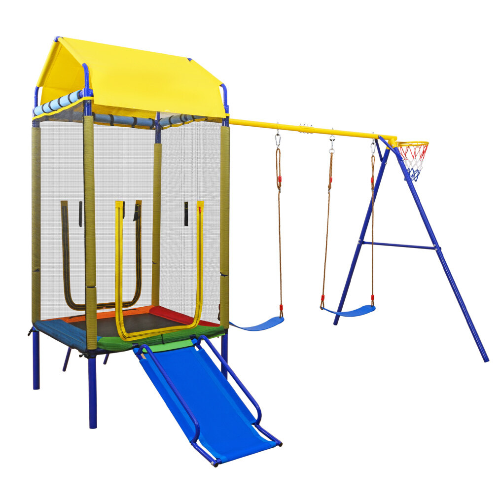 ● 5-in-1 Multifunctional Design: This outdoor playground set includes a 40" x 40" trampoline equipped with a slide and ladder, 2 belt swings, and a basketball hoop. It invites up to 5 children to bounce, swing, shoot, and climb together, creating a lively backyard amusement park.