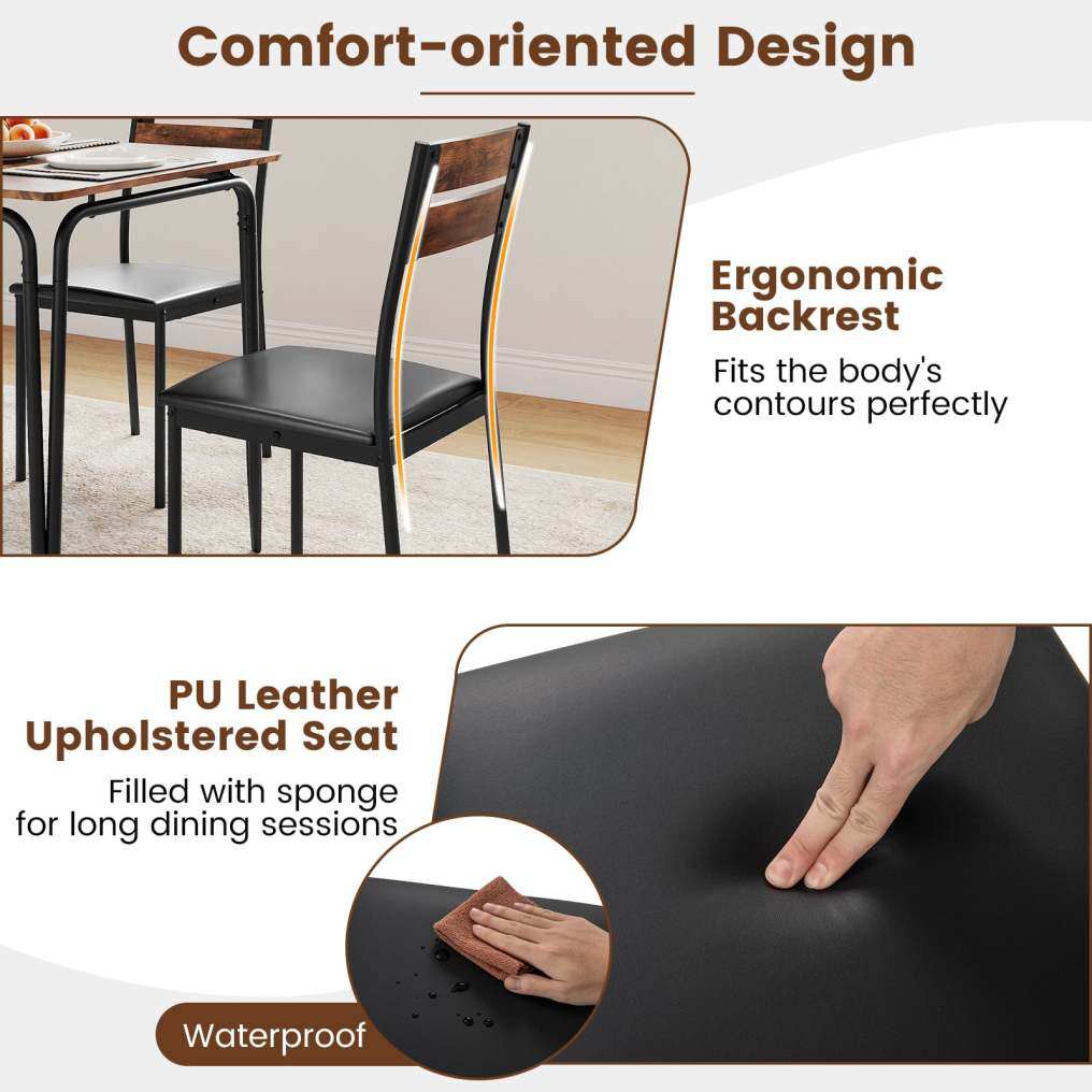 Designed for comfort, the spindle backrest of the kitchen chairs offers ample support for extended sitting periods. Furthermore, the padded PU leather seats are not only easy to maintain but also provide a cozy seating experience. Featuring sturdy 3-point supporting metal legs, the 5 piece dining table set exudes both elegance and robustness. Also, the 4cm thickened board of the dining table enhances sturdiness, while large non-slip pads further enhance the stability. Additionally, the 4 chairs can be tucked under the table when stored, making it an economic choice for apartment or small dining areas.