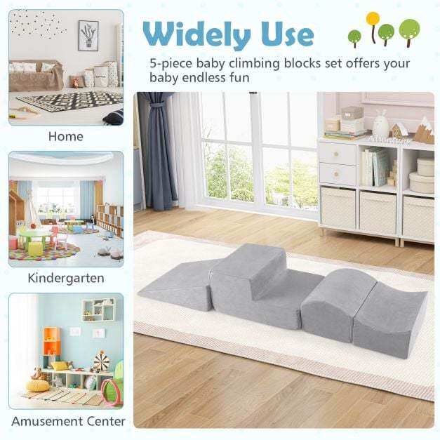 Are you looking for a comfortable indoor home gym for your kids? This 5-piece climbing block set will be an ideal choice. The playset has 5 pieces for kids to combine different shapes or structures for hours of fun, which burns kid's energy. The skin-friendly fabric cover and soft sponge create a safe and comfortable playing environment for 3+ years old kids. The removable and machine-washable covers are also easy to clean. It doesn't have any sharp edges or a rigid structure, ensuring higher safety. More importantly, it is also EN71 compliant and CPSIA certified.