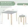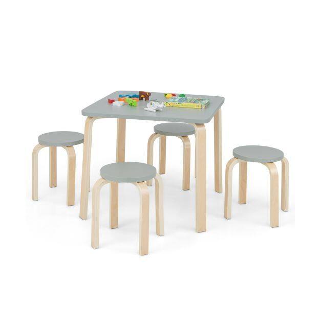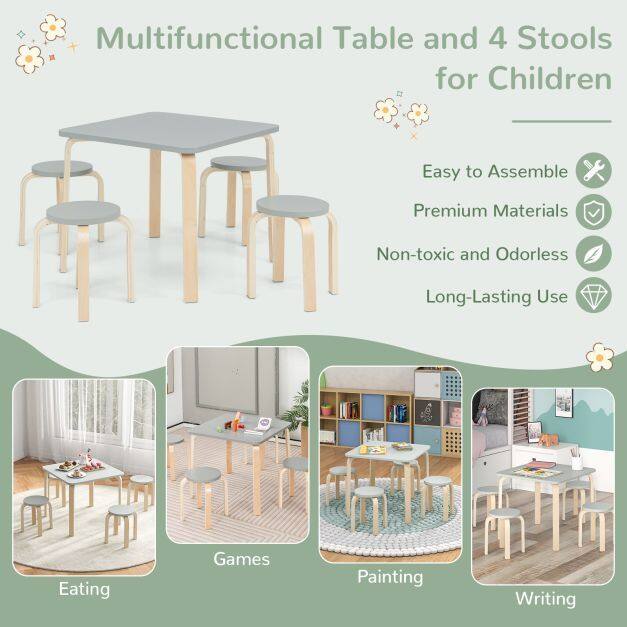 It features 1 square table and 4 round chairs, creating a comfortable environment for kids to eat, draw, study or play. The colorful seat and scientific height make it suitable for kids over 3. Kids can use this furniture set in kid's room, play room, daycare, kindergarten and more. Besides, made of premium birch wood and poplar wood, our kids table and chair set can accompany children for years. Curved edges avoid accidental bumping and protect kids' safety. What's more, solid legs and non-slip felt foot pads keep it stable and sturdy. And the table and 4 chairs are easy to put together and clean.