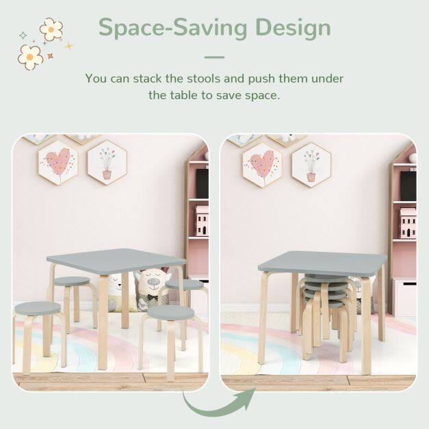 Stackable Stools to Save Space: 4 backless stools are able to hold up to 4 kids, enabling your little one to interact or play with their friends. In addition, when not in use, you can easily place all stools in stacks and store the stacked set under the tabletop to save more space.