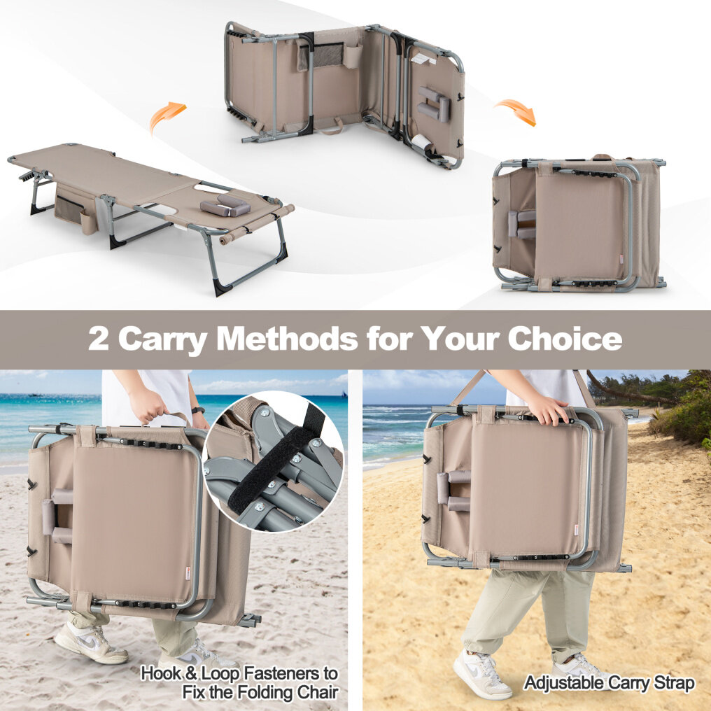 ● Lying Comfortably in 2 Ways: This versatile beach chair comes with a removable pillow and a cushioned face pillow. So you can enjoy the view towards the beach with the support of a comfortable headrest. Likewise, you can play with your phone or read a magazine face-down through the face hole and arm slots.