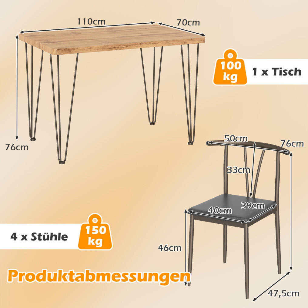 Dining table set for 4 people: This rectangular dining set consists of a 110 x 70 x 76 cm (L x W x H) table and 4 chairs, perfectly sized for comfortable meals and family gatherings. Each chair measures 40 x 47.5 x 76 cm (L x W x H).