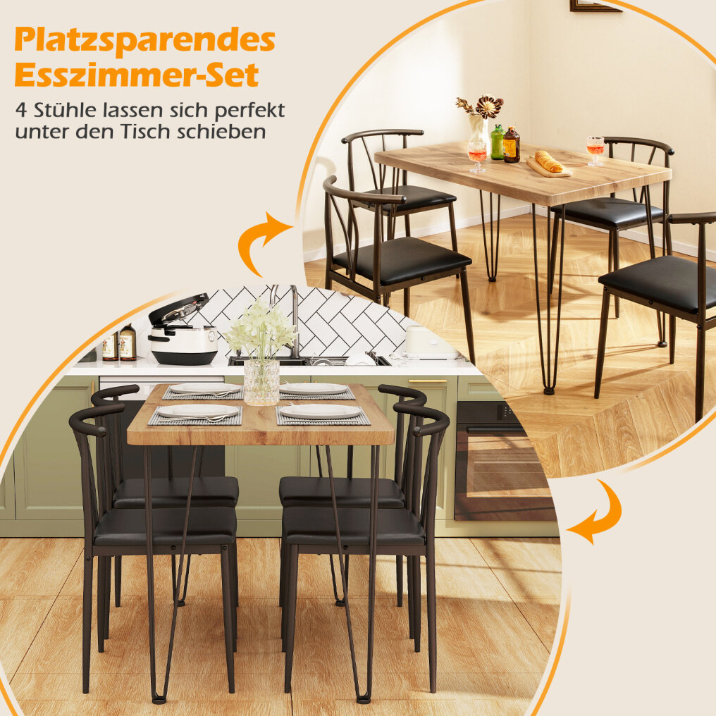 The spindle-shaped backrests of the kitchen chairs provide comfortable support, even during extended periods of sitting. The upholstered faux leather seats are easy to clean and offer a comfortable seating experience. The 5-piece dining table set impresses with its sturdy 3-point metal legs, combining elegance and stability. The 4 cm thick tabletop enhances stability, while large, non-slip pads further improve stability. Additionally, the four chairs can be tucked away under the table when not in use, making it an economical choice for apartments or small dining areas.
