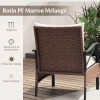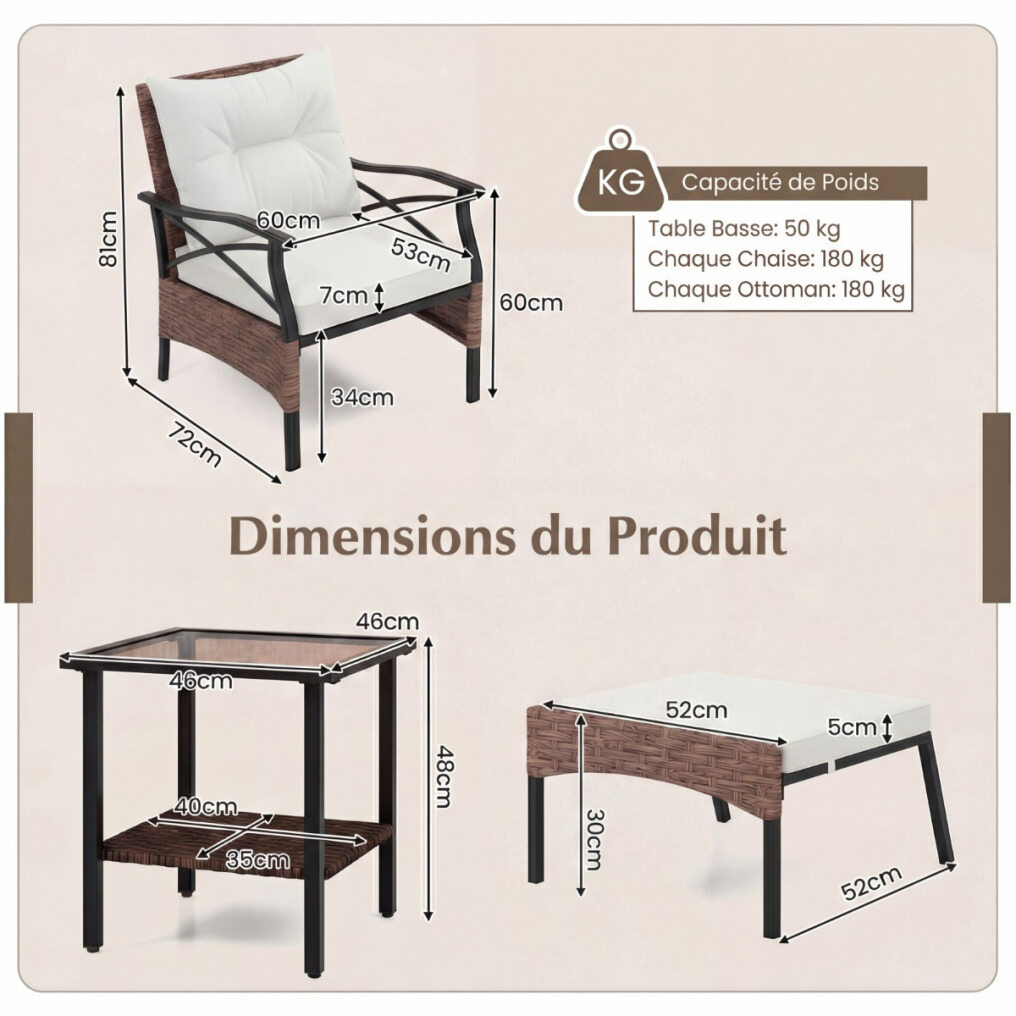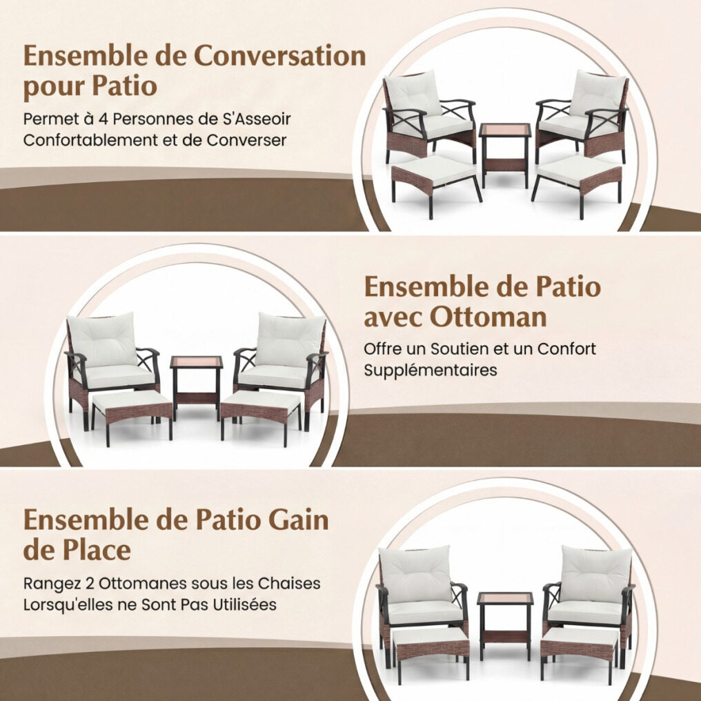 Our 5-piece wicker patio furniture set is crafted from fade-resistant brown PE blend rattan and features a sturdy metal frame, ensuring stability and durability for long-term use. Each chair comes with plush cushions for comfort and is complemented by matching ottomans. The 2-tier coffee table offers added convenience by providing a dedicated space for your drinks and snacks, keeping them within easy reach. To save space, simply tuck the ottomans under the chairs when not in use.