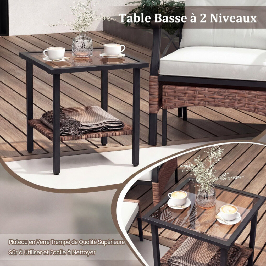 【2-Tier Coffee Table】This patio set includes a 2-tier tempered glass side table that keeps your favorite drinks, snacks, and ornaments within easy reach, eliminating the need to interrupt your relaxation for a refreshment.