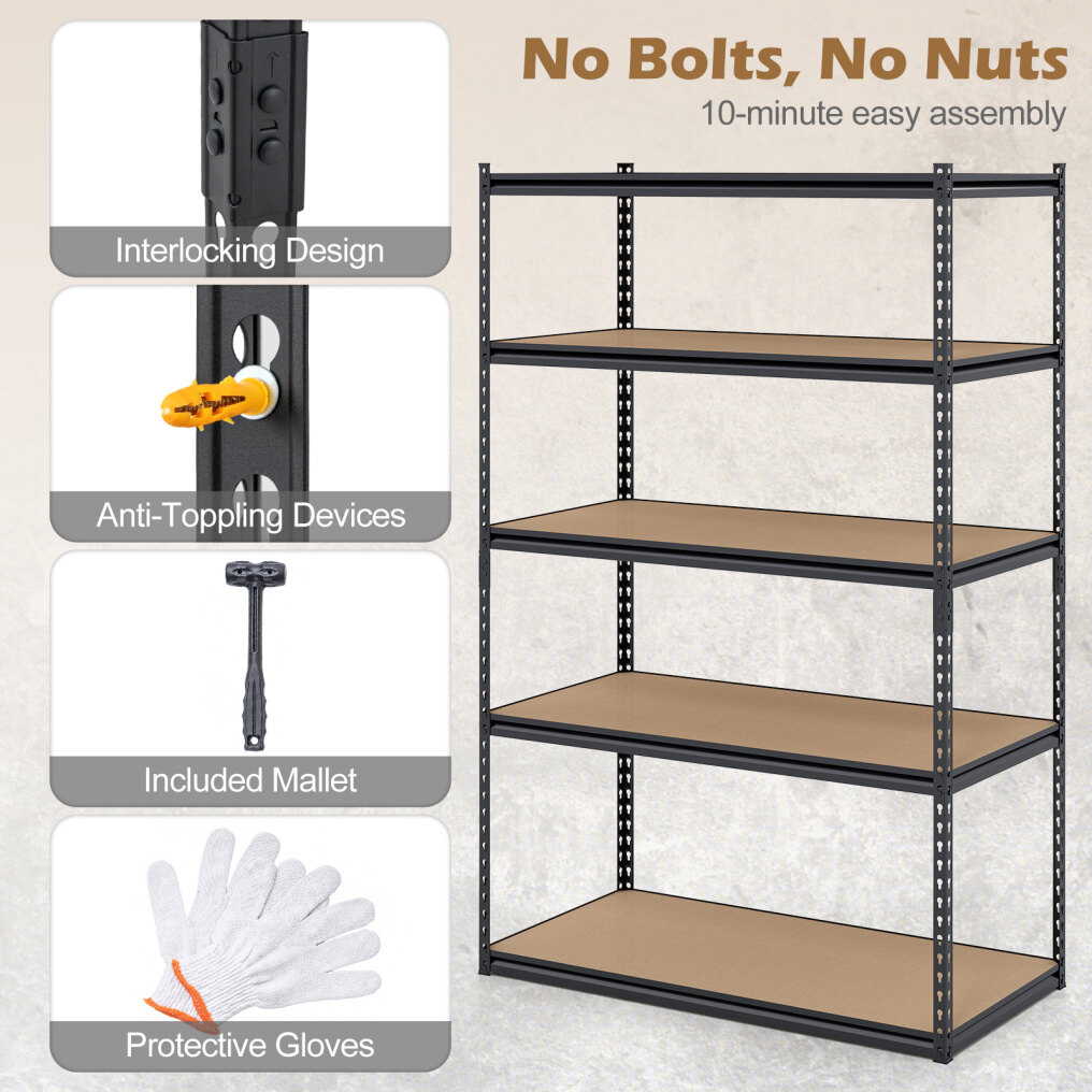 ● Hassle-Free Boltless Assembly: Unlike traditional shelves, the metal storage shelves feature a boltless interlocking design that requires no nuts or screws. With the included mallet and gloves, you can finish the installation in just 10 minutes.
