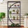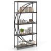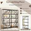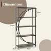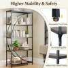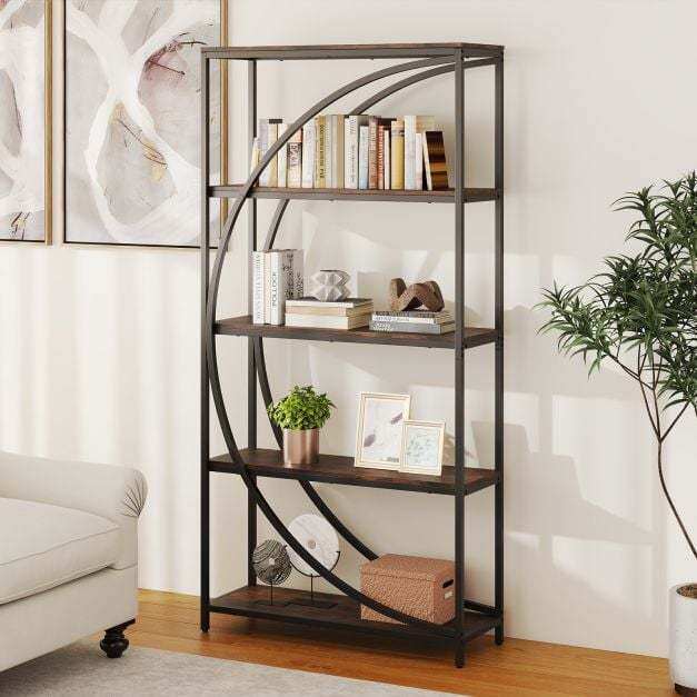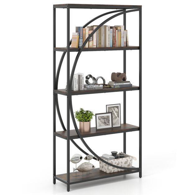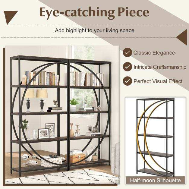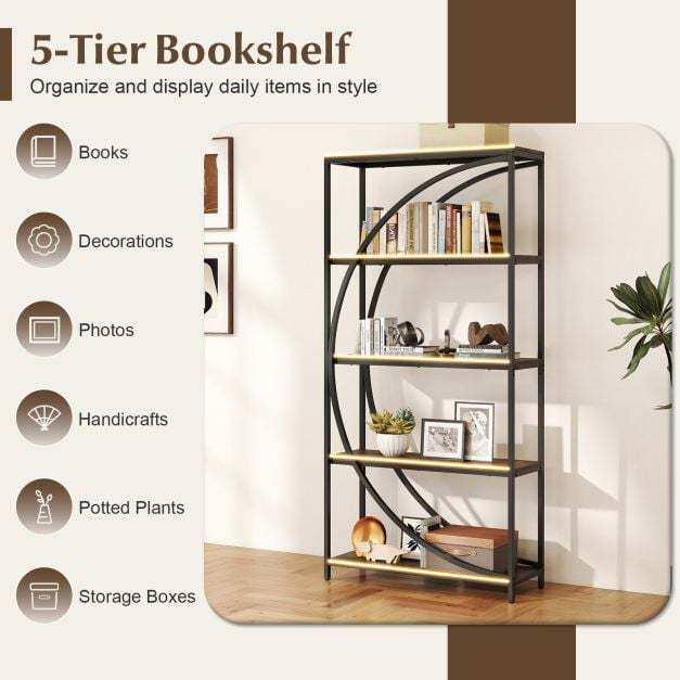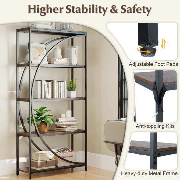 The etagere bookcase features half-moon silhouette that adds highlight to your living space. Organize and display your books, decorations, and storage boxes on this versatile storage organizer. Its 5-tier design offers ample storage space while creating a visually appealing focal point in your room. The freestanding tall display shelf is supported by robust metal frame for long-lasting use. For added safety, anti-toppling kits are included to secure the bookshelf in place. Whether placed in the living room, home office, or study, this bookcase is the perfect blend of intricate craftsmanship and classic elegance.