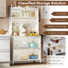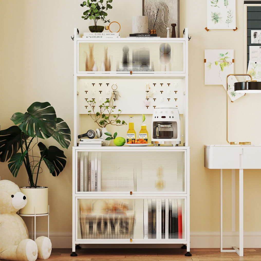 Designed with flexibility, this kitchen storage cabinet allows you to install 4 universal wheels for easy mobility or 4 adjustable foot pads for stability. The translucent flip doors with aluminum alloy knobs offer easy access to items while giving a contemporary aesthetic to create a cozy touch. For security, this 5-tier microwave stand features an anti-toppling device and raised guardrails. The ample storage space keeps your kitchen essentials organized. Additionally, the coffee bar cabinet boasts a multi-layered metal frame for durability. Whether placed in the kitchen, living room or bathroom, this multifunctional storage cabinet is a perfect complement.