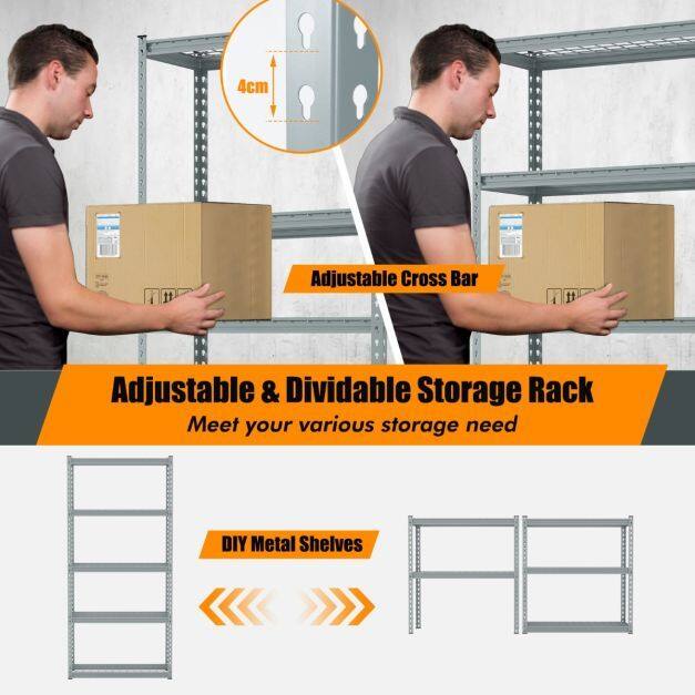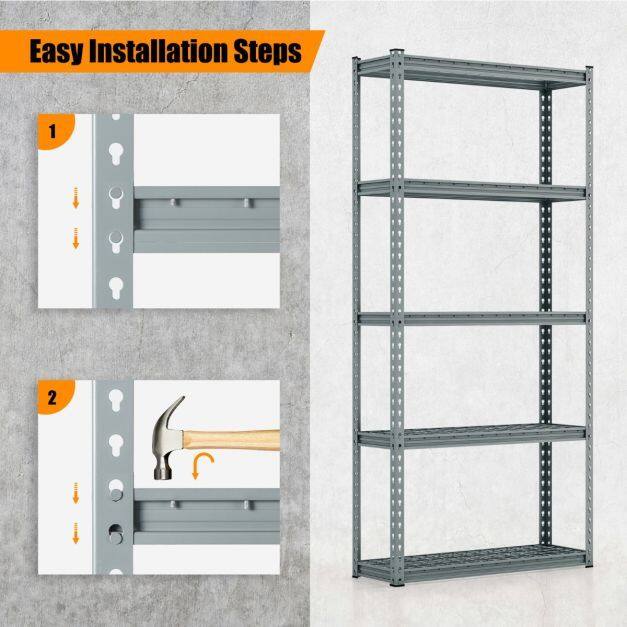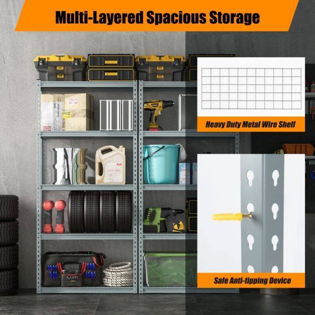 With four/five spacious storage layers, this standing shelf unit is perfect for organizing your garage, living room, or kitchen. You can neatly accommodate your tool box, electric appliances, books, plants, bowls, and seasoning bottles in it. Moreover, the adjustable design of this shelf allows you to customize the height of each tier, making it suitable for items of different sizes. Additionally, it can be effortlessly divided into two smaller shelves, providing you with the flexibility to arrange and organize your belongings to your need. In addition, crafted with safety in mind, this metal wire shelf boasts a sturdy and stable structure with a high load capacity. Furthermore, made from premium-quality metal, this four/five-tier storage shelf is durable and reliable for long-term use. The powder-coated metal material adds strength and durability to the product, making it resistant to water and rust. Last but not least, the shelf requires only a hammer for assembly, making the whole process quick, effortless, and hassle-free.