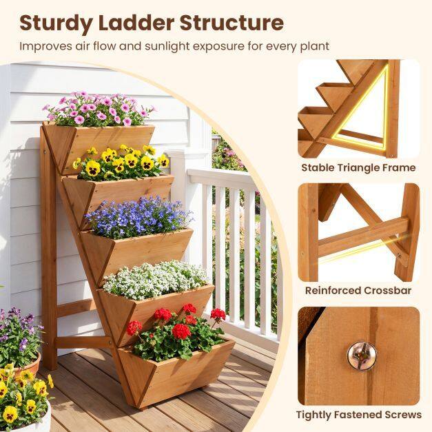 This vertical planter is made of natural fir wood, renowned for its high hardness and excellent compressive strength, ensuring resistance to warping and cracking even after prolonged use. Its multi-tiered structure maximizes vertical space, making it particularly suitable for compact balconies, garden corners, and other limited areas. The trapezoidal slope ensures each tier receives even sunlight, while also promoting air circulation and allowing vegetables, flowers, and herbs to grow in optimal conditions. In addition to being a practical growing tool, it also serves as an elegant decorative element that enhances any space.