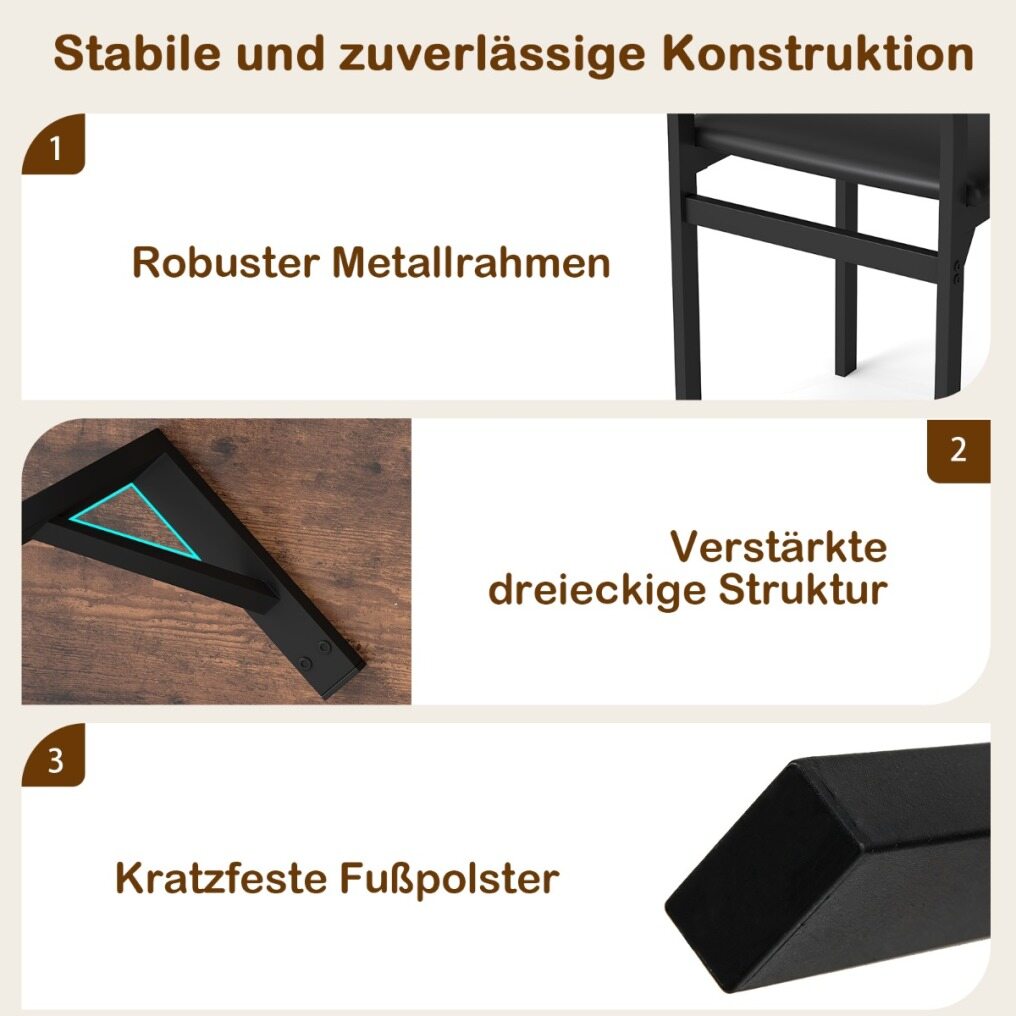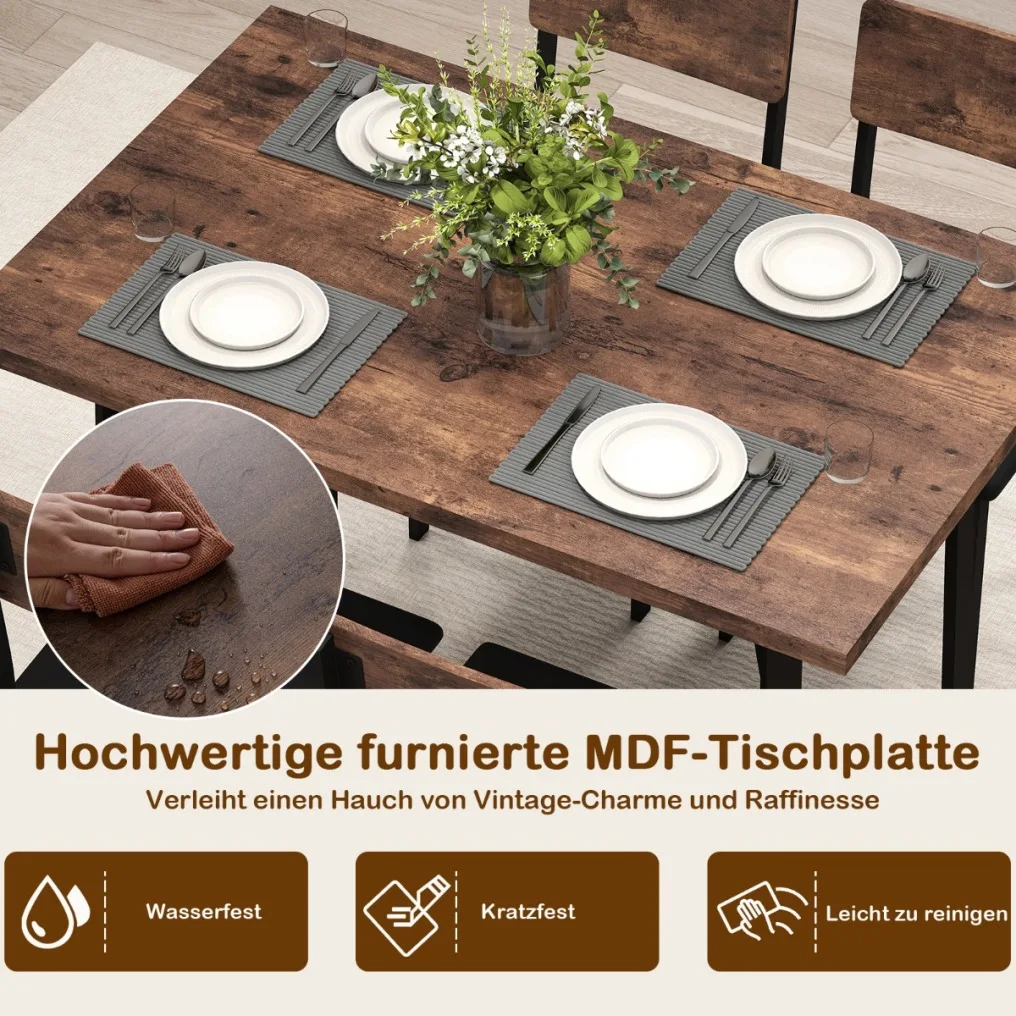 Stable and reliable construction: The dining room set is made of a robust metal frame and is particularly stable and durable thanks to triangular bracing on the underside. Additionally, non-slip feet protect the floor from damage.