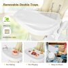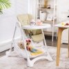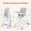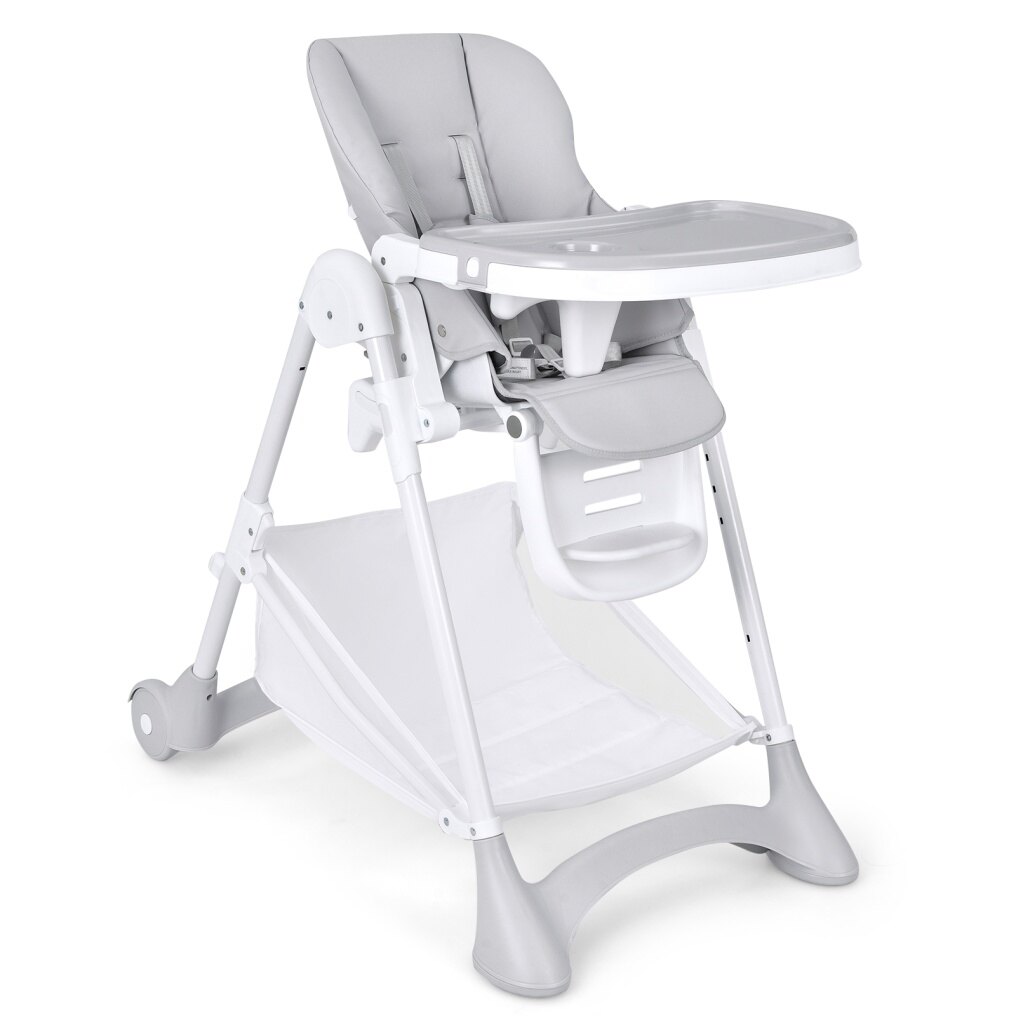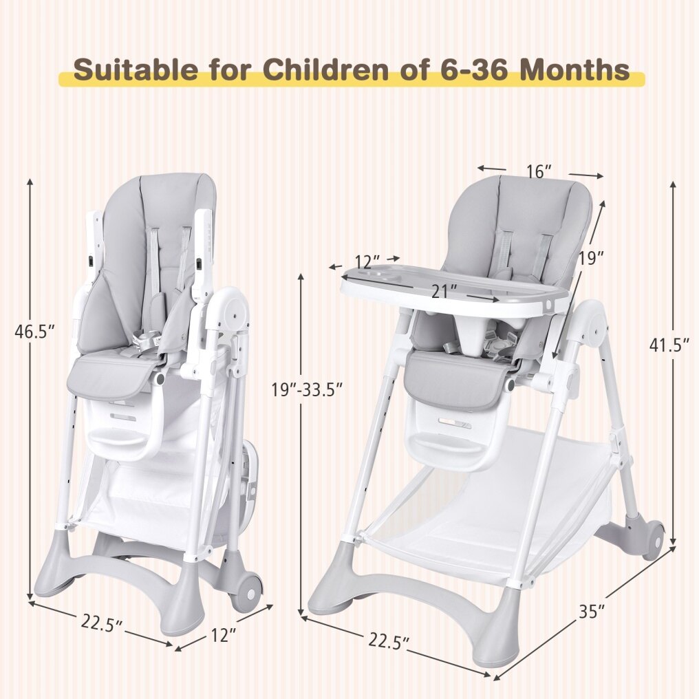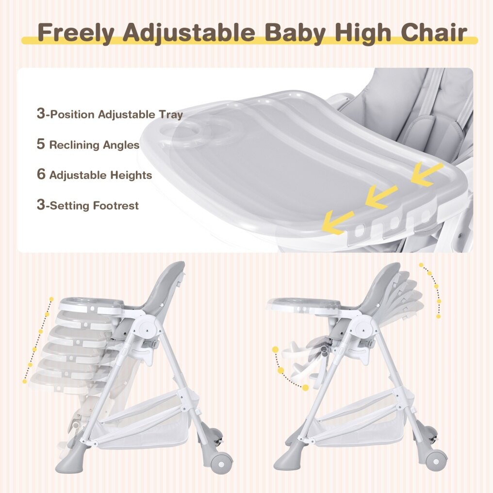 The high chair features 5 recline positions, 3-position footrest with 3 adjustable heights to keep your baby comfortable during meals or rest. 6 height positions are provided to match dining tables at different heights. The removable tray also has 3 positions to grow with your baby. Thanks to the stable A-shaped metal tube structure, 5-point safety harness and smooth edges, babies will have a safe dining and resting and playing area on this high chair. The removable and waterproof PU cushion cover is easy to wipe clean. Besides, the large storage basket under the chair is convenient to place your baby's stuff. When you're not using this chair, it can be quickly folded up and placed in the corner or next to the cupboard which will not occupy much space.