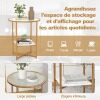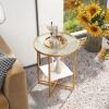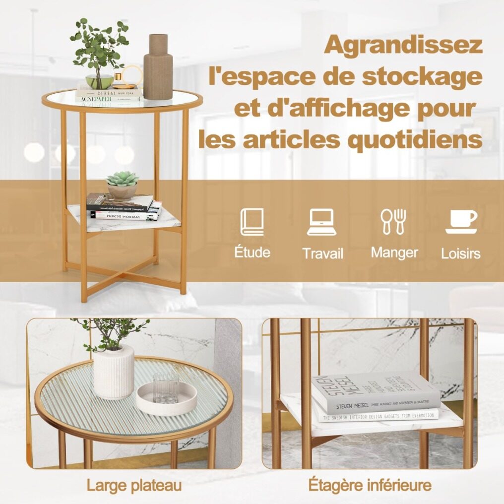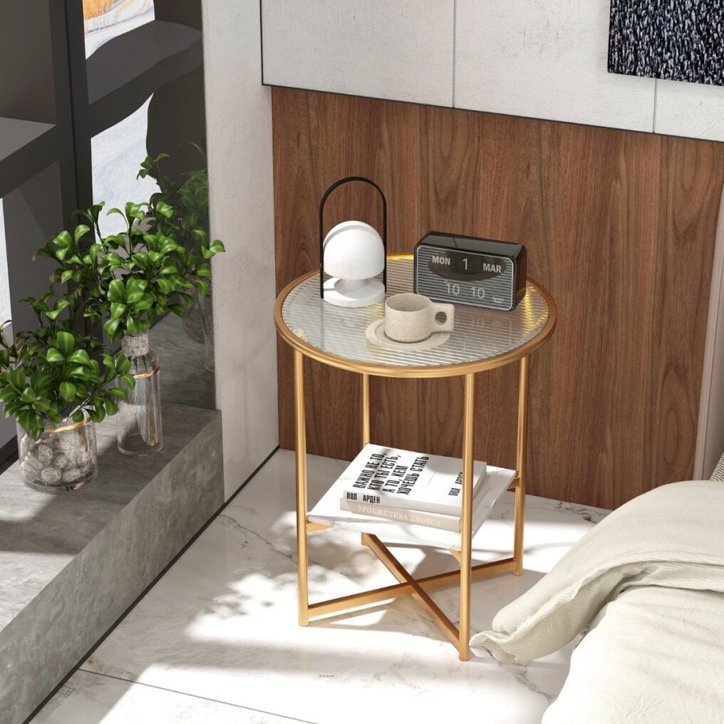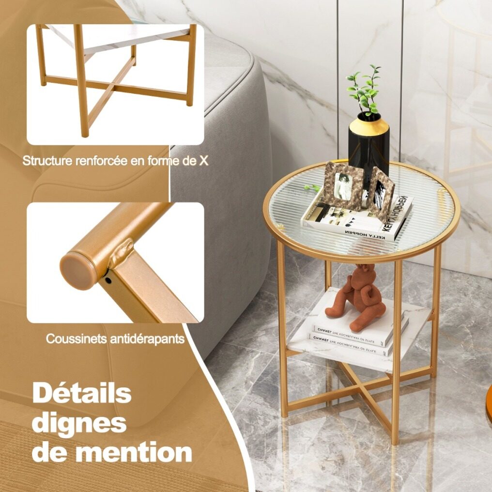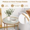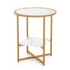 Enhance the aesthetics of your home with this modern glass end table! The side table is a firm and well-crafted piece that integrates solid tempered glass top and powder-coated metal tubes, ensuring longer service life. For storage convenience, the end table features 2-tier glass to keep items within reach and release you from trouble of messy small stuffs. Besides, the compact design makes it perfect for small space and works equally well near the bed or sofa. Blending stylish faux marble lower shelf and matte gold frame, the glass end table sets the tone for a home of livable elegance.