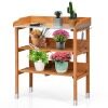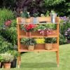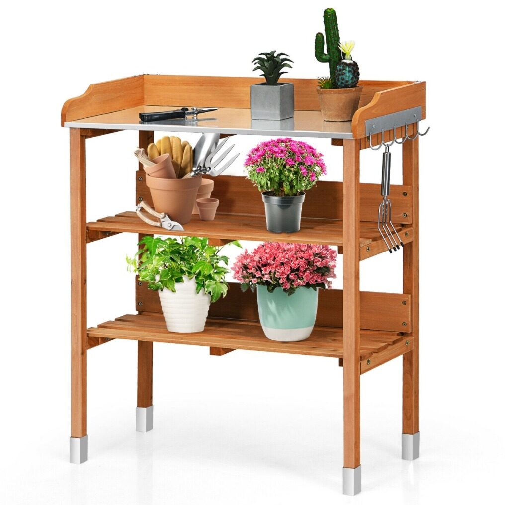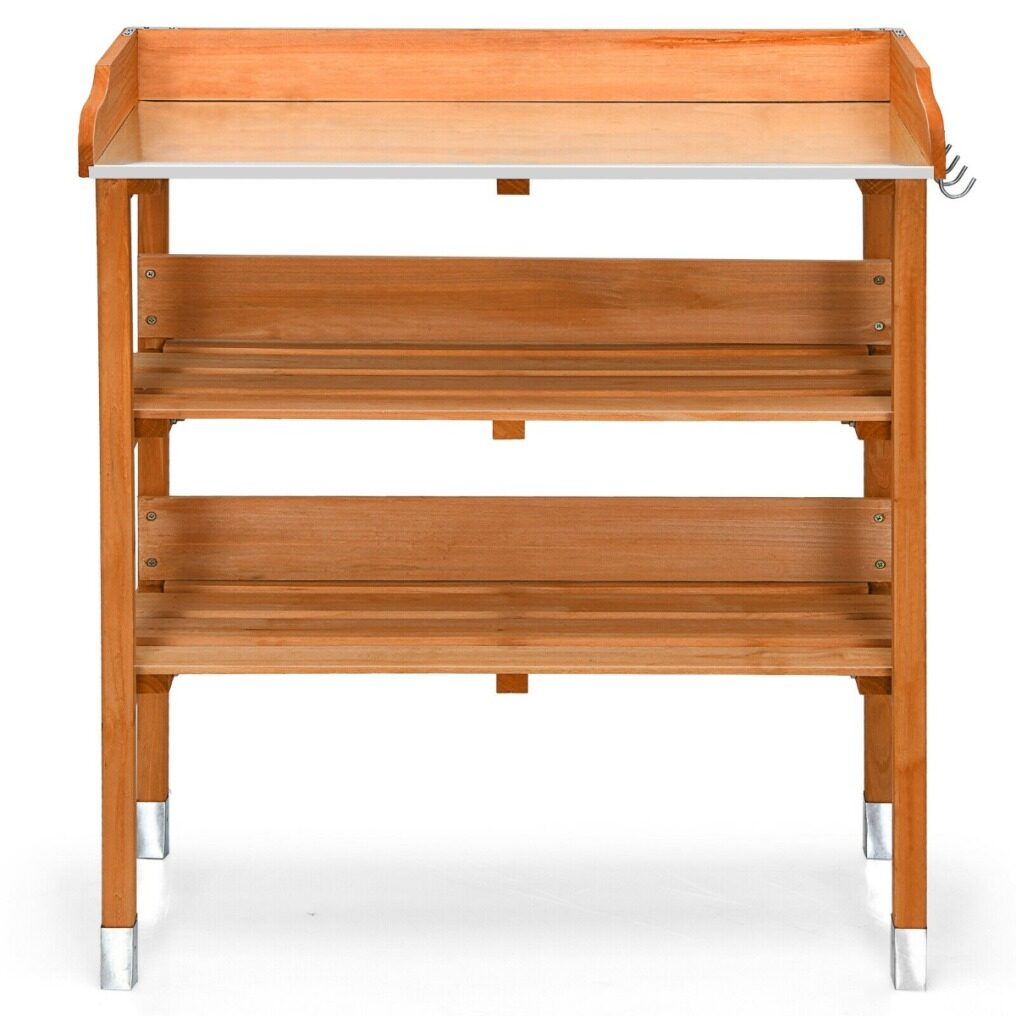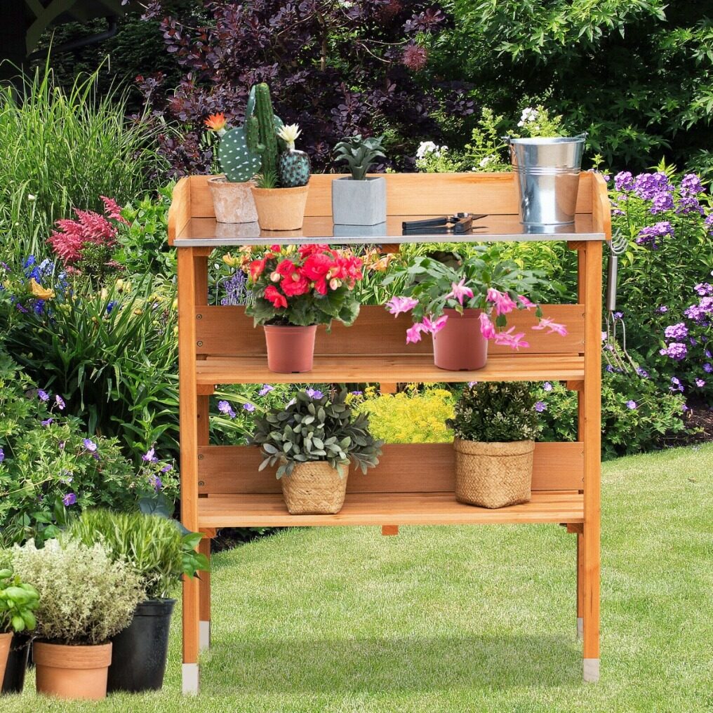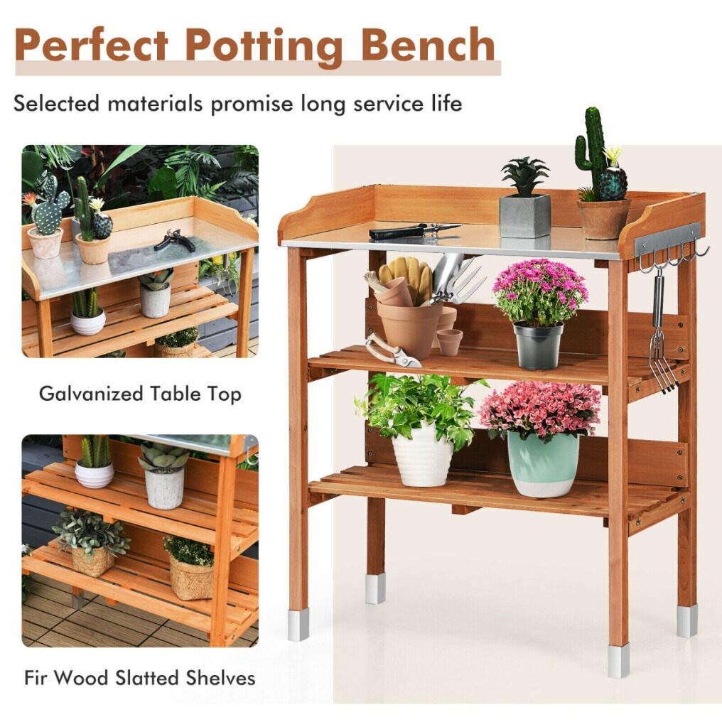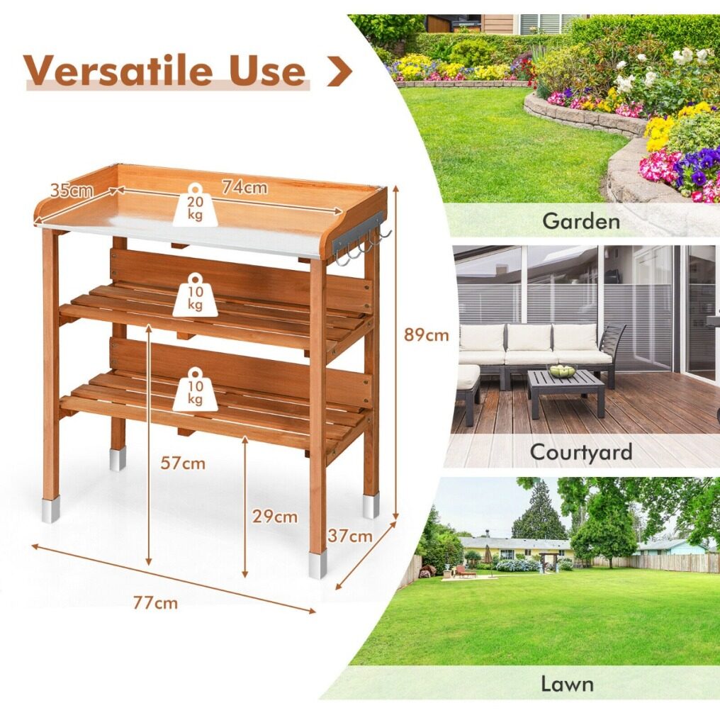 This wooden potting bench is made from natural fir wood and designed for both indoor and outdoor use. The spacious and smooth galvanized table top can not only put a few pots of flowers, but also facilitate your gardening works on it. Even if it gets dirty, you can simply wipe it off. It features two lower shelf and upper work station, making a great decor piece for your outdoor living area. This wooden multifunctional potted bench can place your favorite flowers for your front yard, hedge, lawn, backyard garden.